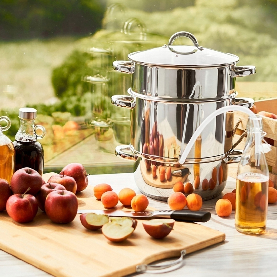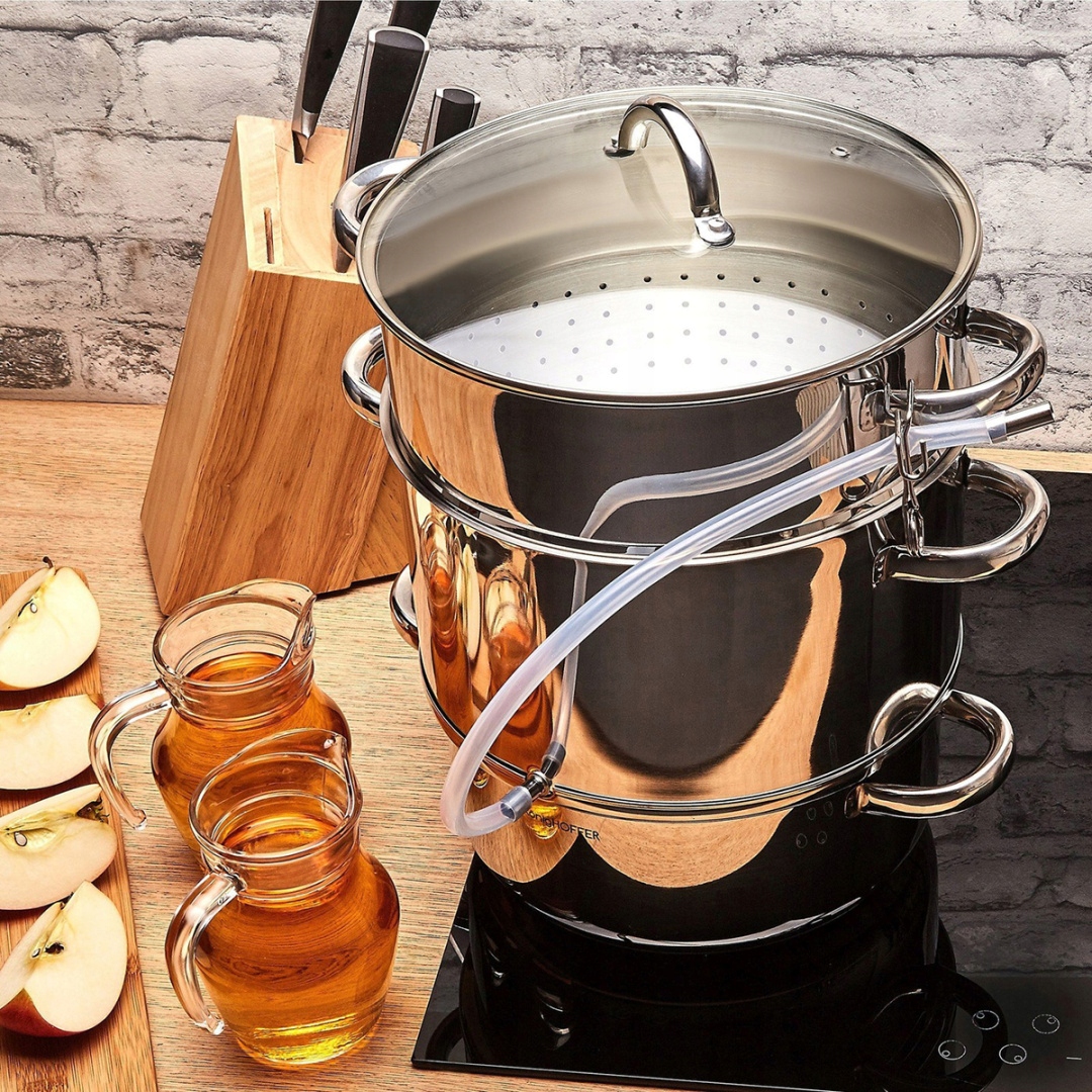 Установите элементы:- Фруктовый горшок, общая емкость: 8,2 л, длина с ручками: 36 см, верхний диаметр: 27,5 см, нижний диаметр: 24 см, высота: 16 см- горшок для сбора сока, общая емкость: 8 л, длина с ручками: 36 см, верхний диаметр: 27,5 см, нижний диаметр: 26 см, высота: 15 см. Диаметр: 26 см, диаметр: 22 см, высота: 12 см- теплостойким крышкой, диаметр: 26 см, высота: 2 см- шланг с зажимом, длина: 42 см, диаметр отверстия: 1 см