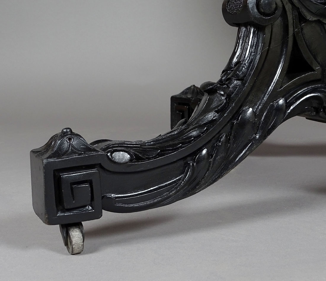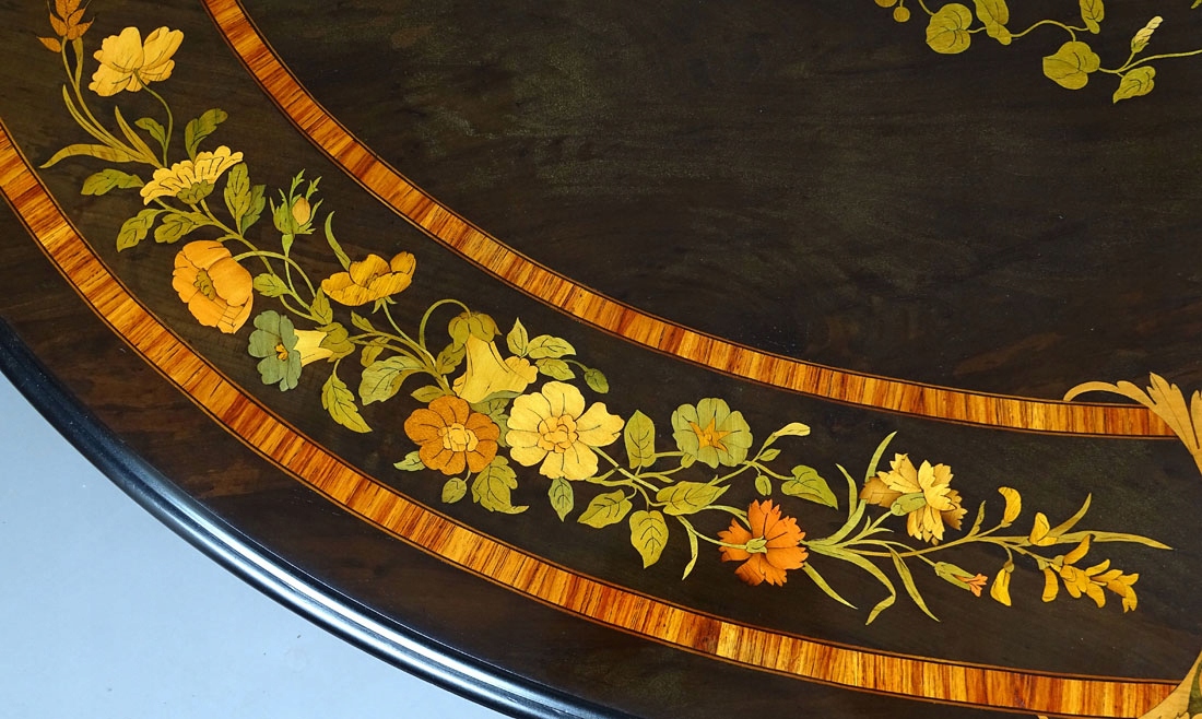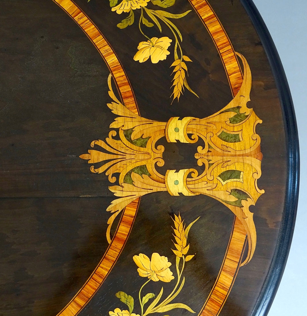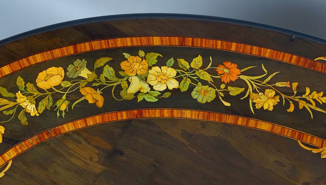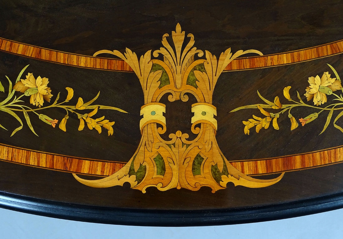 с овальной столешницей, инкрустированной музыкальными инструментами, опирающимися на одну массивную ножку. Под столешницей расположена слегка утопленная черненая полоса с ажурным скосом внизу. Столешница из шпона черного дерева, украшенная по периметру двумя инкрустированными полосками, между которыми на веточках переплетаются цветы и листья. В центре столешницы в цветочном букете, инкрустированном различными породами дерева, расположены несколько музыкальных инструментов, нотная бумага и фонарик. Вал имеет массивную конструкцию, расширяющуюся внизу на четыре ножки с латунными роликами для облегчения движения, богато украшенными резьбой в виде листьев аканта и цветочных бутонов. Столы такого типа чаще всего служили украшением музыкальных комнат.