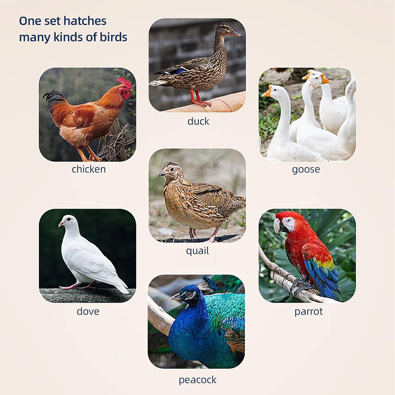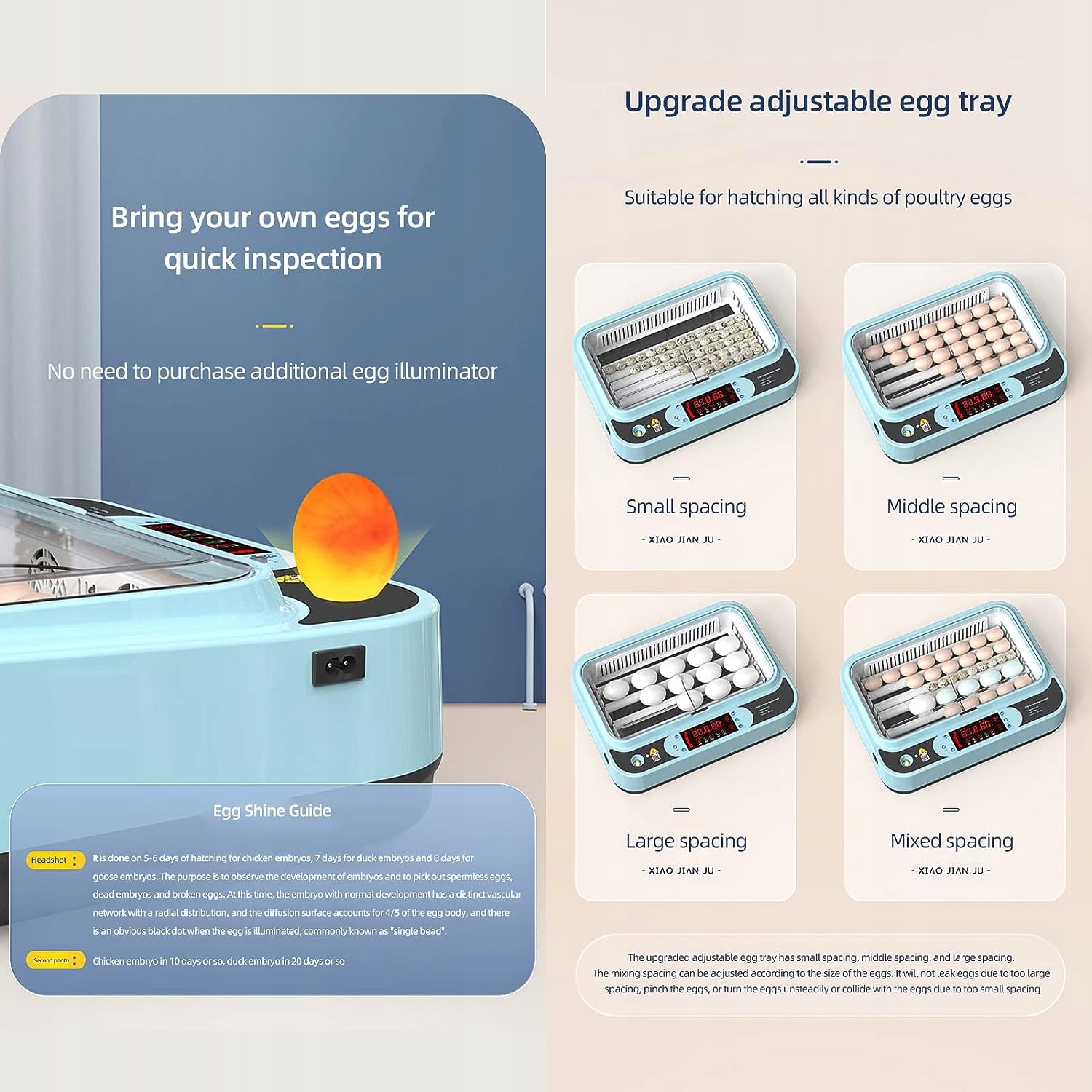 Четкий обзор на 360°. Видимая прозрачная крышка позволяет наблюдать за развитием и вылуплением яиц. Инкубатор для выведения яиц оснащен регулируемым расстоянием между лотками для яиц и подходит для выращивания различных яиц, таких как куриные яйца, утиные яйца, гусиные яйца, голубиные яйца, перепелиные яйца и так далее.