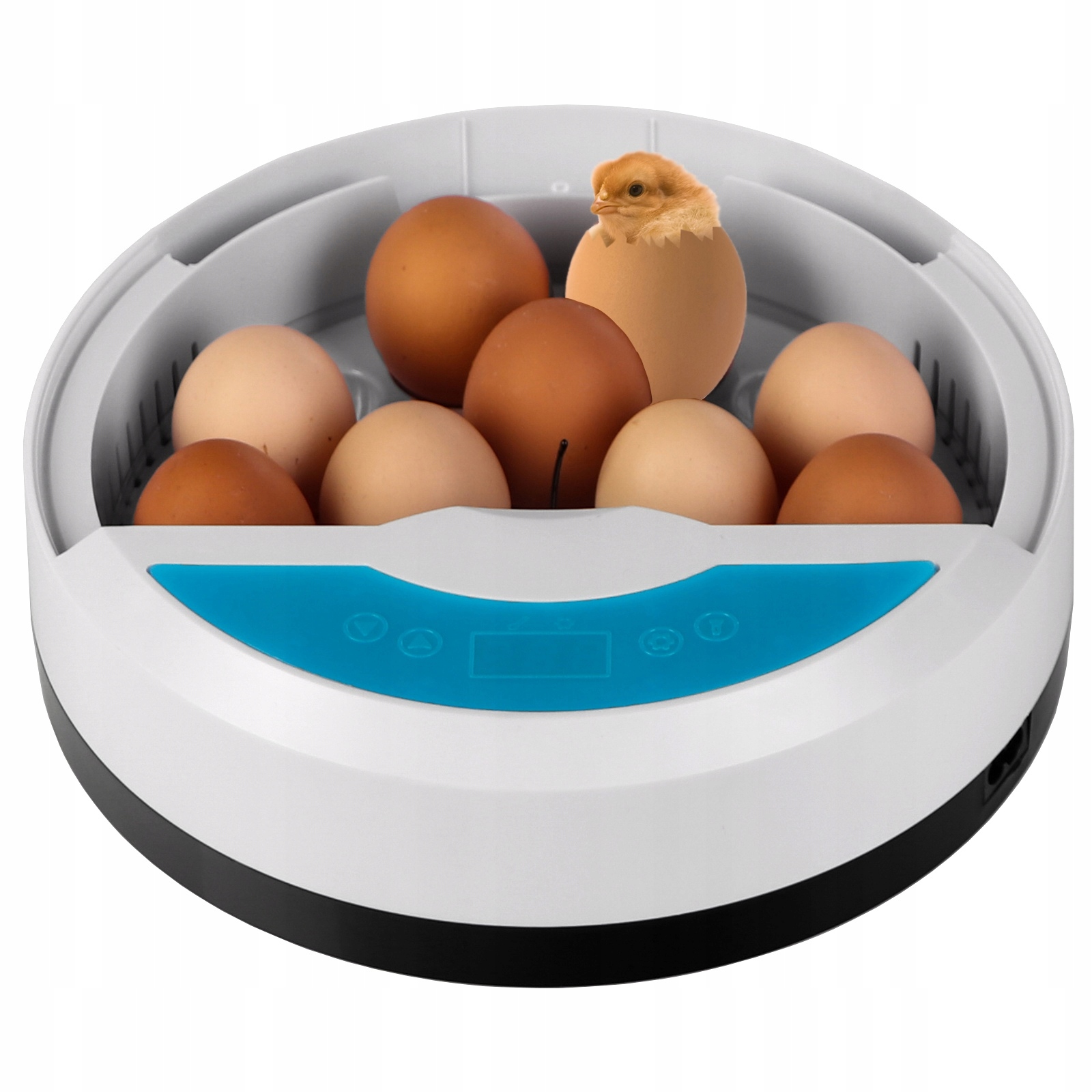 Под каждым большим яйцом (9 шт.) находится мощный светодиод. С помощью кнопки, расположенной на корпусе, вы включите свет, освещающий яйцо. Таким образом вы сможете проверить состояние эмбриона внутри.