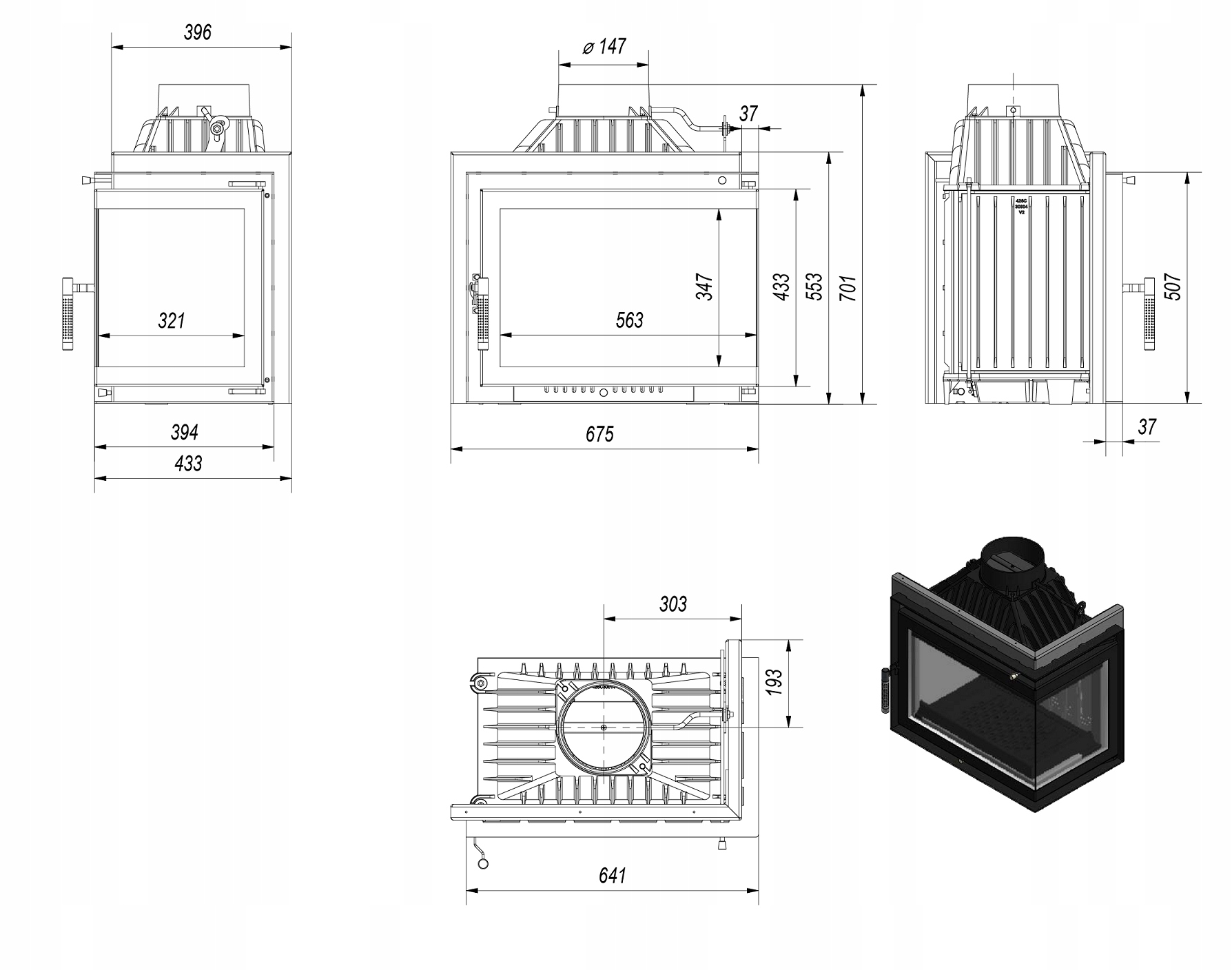INSERT KRATKI кутовий камін SIMPLE m/s BS правий вихід fi150 8kw