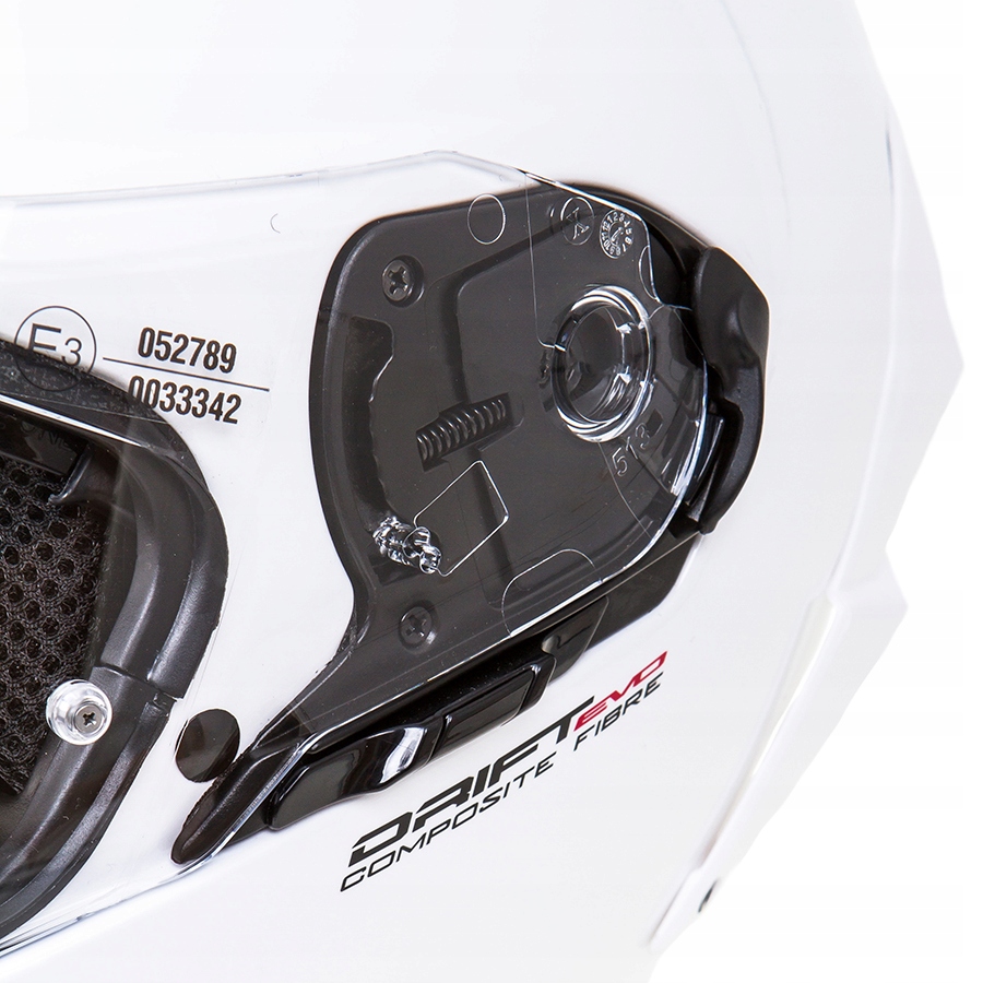 Drift Evo также имеет гибкую съемную крышку подбородка, которая защищает нижнюю часть лица от мелких предметов, переносимых воздухом, безопасна и используется, среди прочего, в типичных спортивных шлемах имеется застежка типа DD.