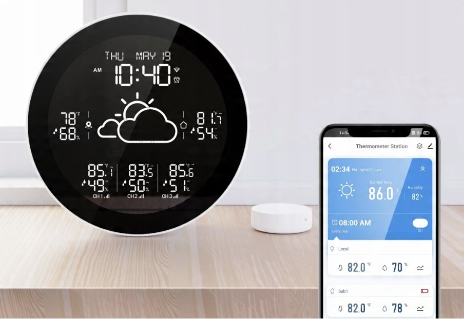 Stacja pogodowa wyświetli prognozę pogody na trzy dni do przodu. Informacje o pogodzie są synchronizowane przez Internet.
