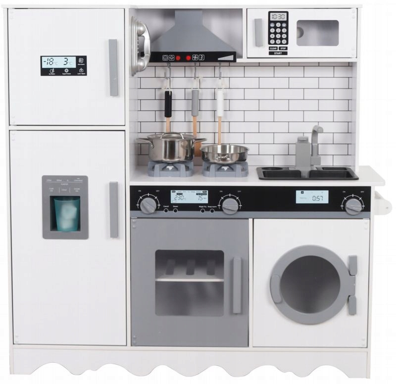 «В стиральной машине, в микроволновой печи, в карнице, в горелках капюшона со звуком и светом Современный дизайн Микроволновая печь со звуками и светом Wooden cooking accessories: spoon, ladle, spatula imitation of ice cubes - after substituting the cup, they automatically fall out like in a real cubether modern design sink with tap tap with real water solid structure Each interior Shelves The large size of the kitchen allows you Играть более одного ребенка одновременно :) Ручки вращаются и щелкните Открытая духовка Открывающаяся стиральная машина Фарона Чашка + 2 кубика Ice Телефон Открывающая дверь каждого падения, заключающаяся в Special System . okap Микроволновая печь холодильник Морозильник Изготовлен из дерева и MDF и пластических элементов Требуется батареи (не входит в комплект) Размеры: 93 (высота) x 96 (Wildth) x 30 C. x 30 C (глубина) Печь оснащена пространственными шкафами и полками для хранения кухонных приборов, а также других необходимых аксессуаров