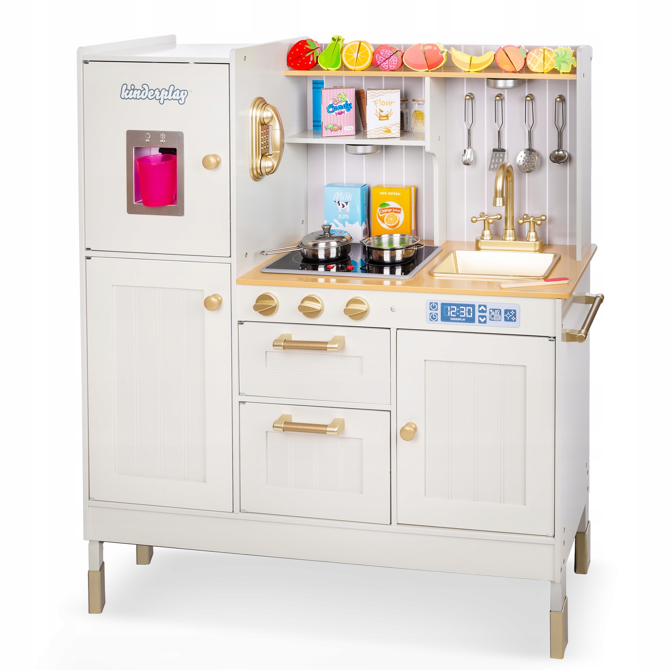 Деревянная кухня Kinderplay в стиле "Vintage" - это полный набор для маленьких поваров, имитирующих боссов, поваров. Имеет, среди прочего, индукционный блюд, дозатор воды, вращающиеся ручки, открывающиеся шкафы, кран, раковина, духовка, карниза, телефон, светодиодное освещение точков.