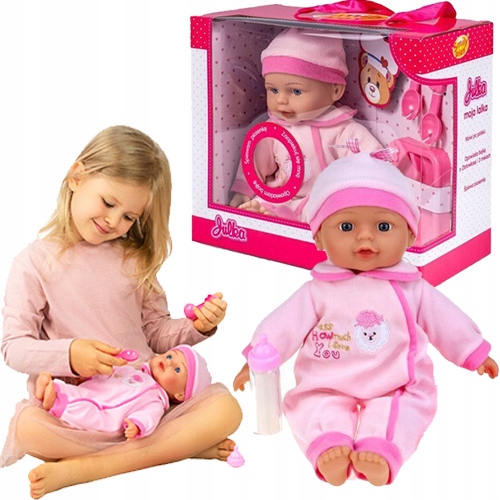Кукла Юлька любит, когда о ней заботятся и кормят. Кукла одета в розовый комбинезон, имеет изысканную тарелку с весами, столовые приборы и бутылочку.