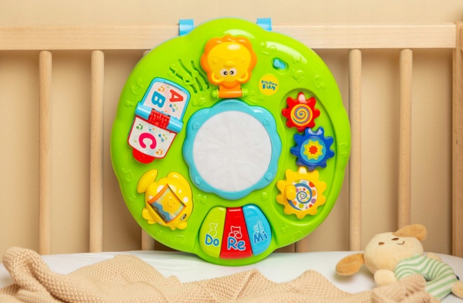 Особенности: - Музыкальная клавиатура - Играет выбранные звуки. - Роллер -рыба - звучит звуки дня и ночи. - Забронируйте с помощью алфавита и номеров - играть в веселые мелодии, когда он переворачивает страницу книги. - Зеркало - покрыто изображением животного. - Система колеса - полезно в изучении моторических навыков ребенка. - Кнопка подсветки посередине - мигает во многих цветах и играет красивые мелодии.