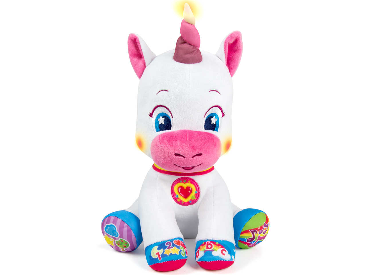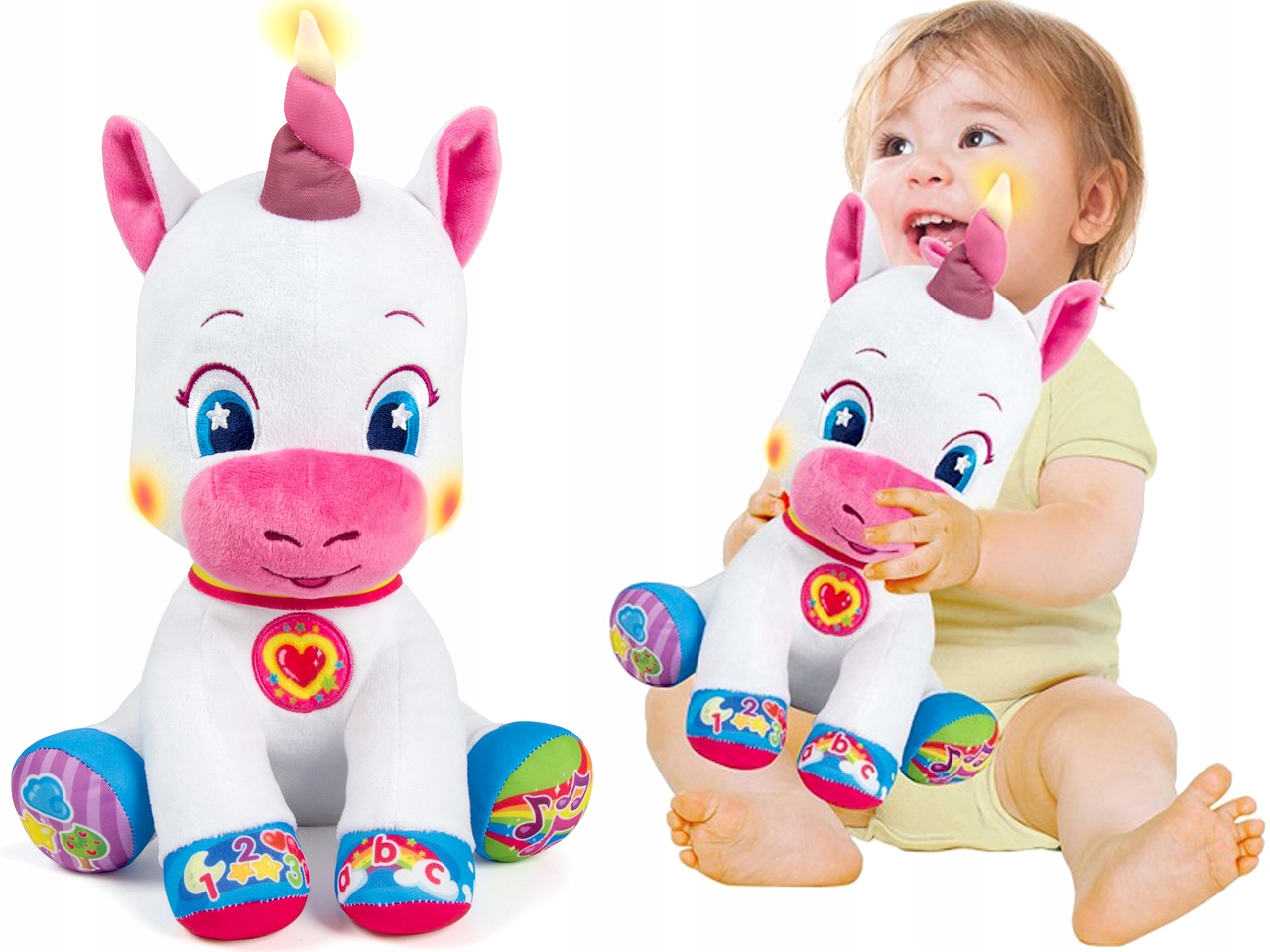 Интерактивный единорог от Clementoni — мягкая игрушка с пятью интерактивными кнопками для изучения первых цифр, букв, форм и цветов.