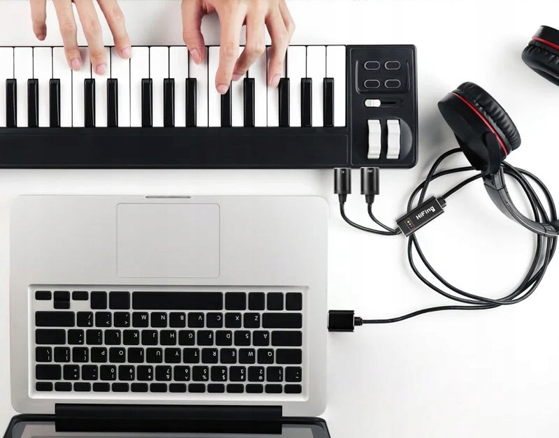 - Простой в установке адаптер с входными и выходными MIDI-кабелями и интерфейсным разъемом USB-C/USB-A.