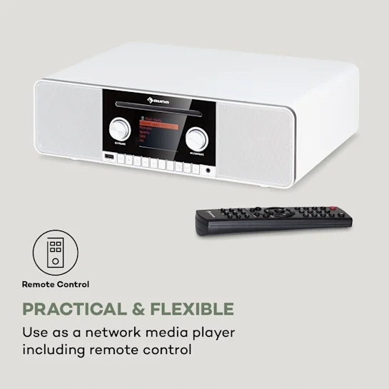 Помимо возможности беспроводного воспроизведения музыки, интернет-радиоauna Connect CD MKII также предлагает классический линейный вход для подключения кабельных аудиоисточников, таких как мобильные телефоны или компьютеры. Кроме того, вы можете загружать портативные музыкальные файлы в устройство через USB-порт, поддерживающий формат MP3. Проигрыватель компакт-дисков совместим и читает популярные компакт-диски, а также широко распространенный формат MP3. Достаточный выбор, чтобы удовлетворить самые разнообразные музыкальные ожидания.