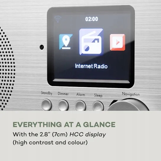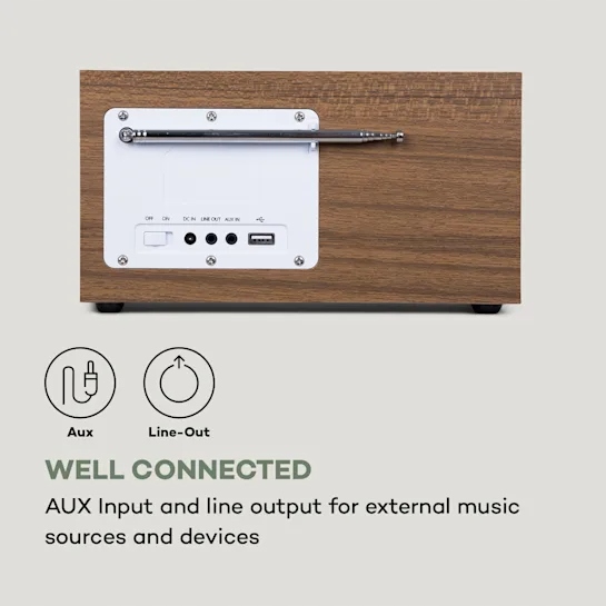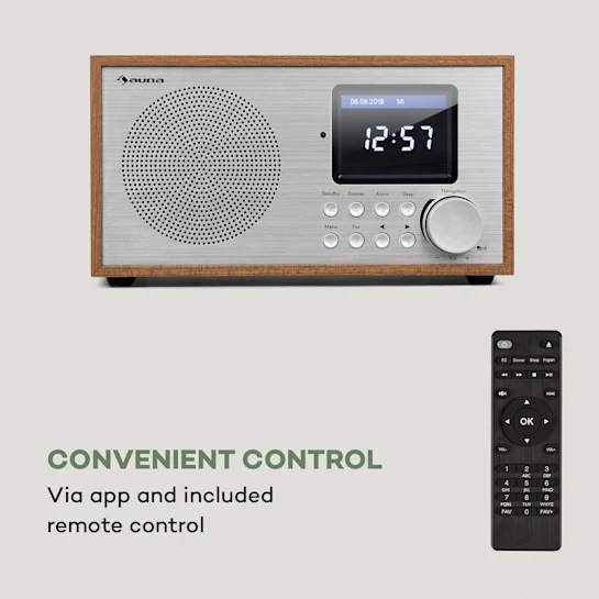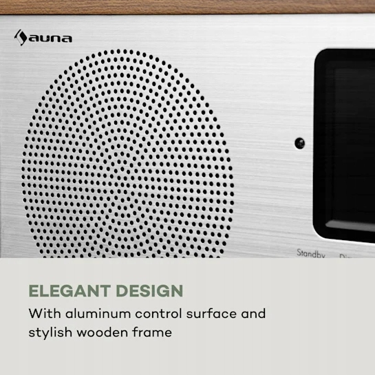 Время качественных музыкальных развлечений! Интернет-радио auna Silver Star Mini DAB+/FM – это настоящий музыкальный мультиталант и удачное сочетание впечатляющей мощности, многофункциональности и элегантного внешнего вида в одном устройстве. Благодаря выходной мощности 8 Вт (среднеквадратическая) универсальное радио обеспечивает высочайшее качество звука как часть оборудования на кухне, в ванной или гостиной. Для беспроводного подключения предусмотрена встроенная функция Bluetooth, позволяющая быстро и легко воспроизводить мультимедийный контент с внешних устройств. Соединение Wi-Fi радио позволяет принимать 10 000 интернет-радиостанций и использовать устройство в качестве сетевого плеера. Радио подключается к другим устройствам в сети с помощью приложения Air Music Control и позволяет осуществлять потоковую передачу музыки в стандарте UPnP/DLNA. Благодаря тюнеру DAB+ все радиостанции, кроме аналогового FM-тюнера, можно принимать в цифровом формате и обеспечивать высочайшее качество звука со стабильным, бесшумным звуком. Дополнительные текстовые и графические службы DAB+, например, программы передач, информация, новости, музыкальные треки, отображаются на большом дисплее HCC размером 2,8 дюйма (7 см) (высокая контрастность и цвет). Доступ к другим источникам музыки возможен через линейный вход и порт USB на задней панели, расширяющий аудиосистему дополнительным музыкальным контентом со смартфонов, ноутбуков, USB-накопителей и MP3-плееров.Интернет-радио управляется с передней панели управления или удобно с помощью пульта дистанционного управления или приложения Air Music Control.Очень Полезно также наличие программируемой функции двойного будильника и режима повтора.Помимо технических деталей, рация также привлекает внимание своей тонкой деревянной рамой, которая придает этому мультиталанту с алюминиевой панелью управления исключительную элегантность и еще больше увеличивает ее ценность.