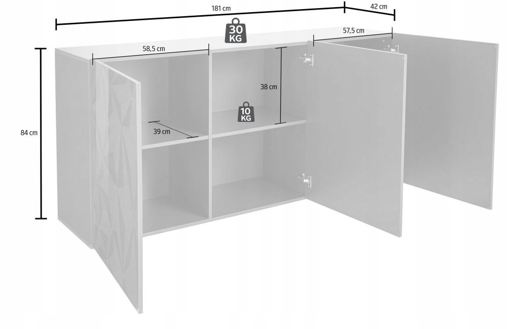 Из итальянской коллекции мебели Como. Тело и передняя часть комостей изготовлены из высококачественной лакированной плиты с высоким содержанием глины белого цвета. Фронты украшены рисунком, который придает всем современному и уникальному характеру. Внутри есть три полки.