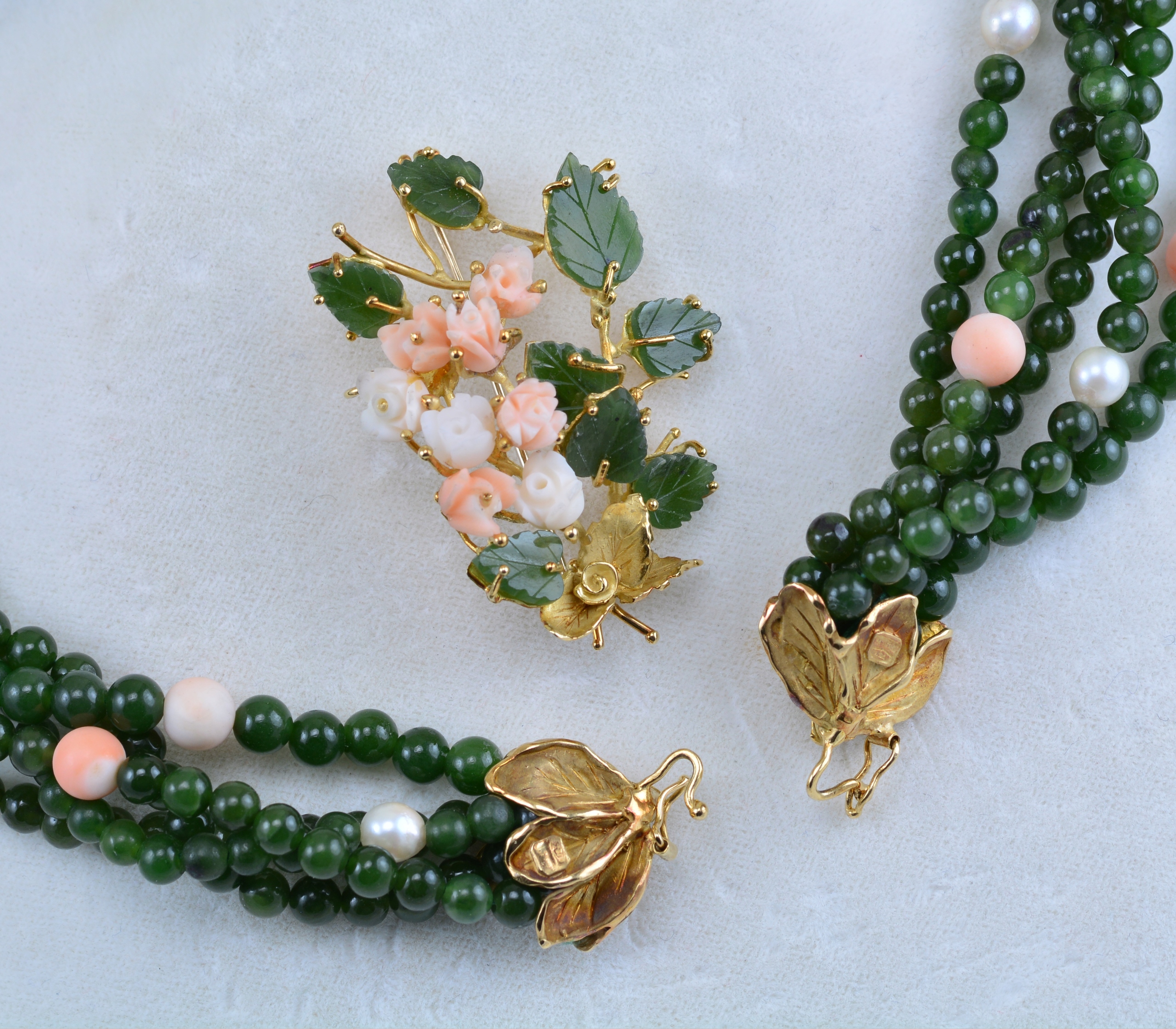 - Ожерелье. Ожерелье в форме нефритических струн шариков диаметром 4,5 мм, разделенное разведенным жемчугом и кораллами. Золотая застежка 18K, увенчанная впечатляющей деталью в виде броши, украшенной коралловыми розами. Интересно, что застежка можно носить отдельно как брошь. Ожерелье является примером многофункциональных украшений.