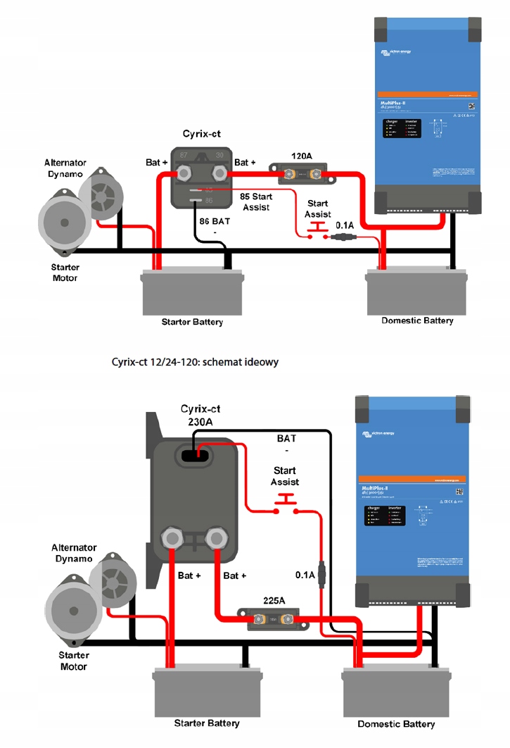 Переключатель Cyrix измеряет напряжение на обеих подключенных батареях. Поэтому он включится, если, например, вспомогательный аккумулятор зарядится с помощью зарядного устройства. Cyrix-ct 12/24 может питаться от двух напряжений. Он также закроется, если напряжение на одной из батарей слишком низкое для его работы.