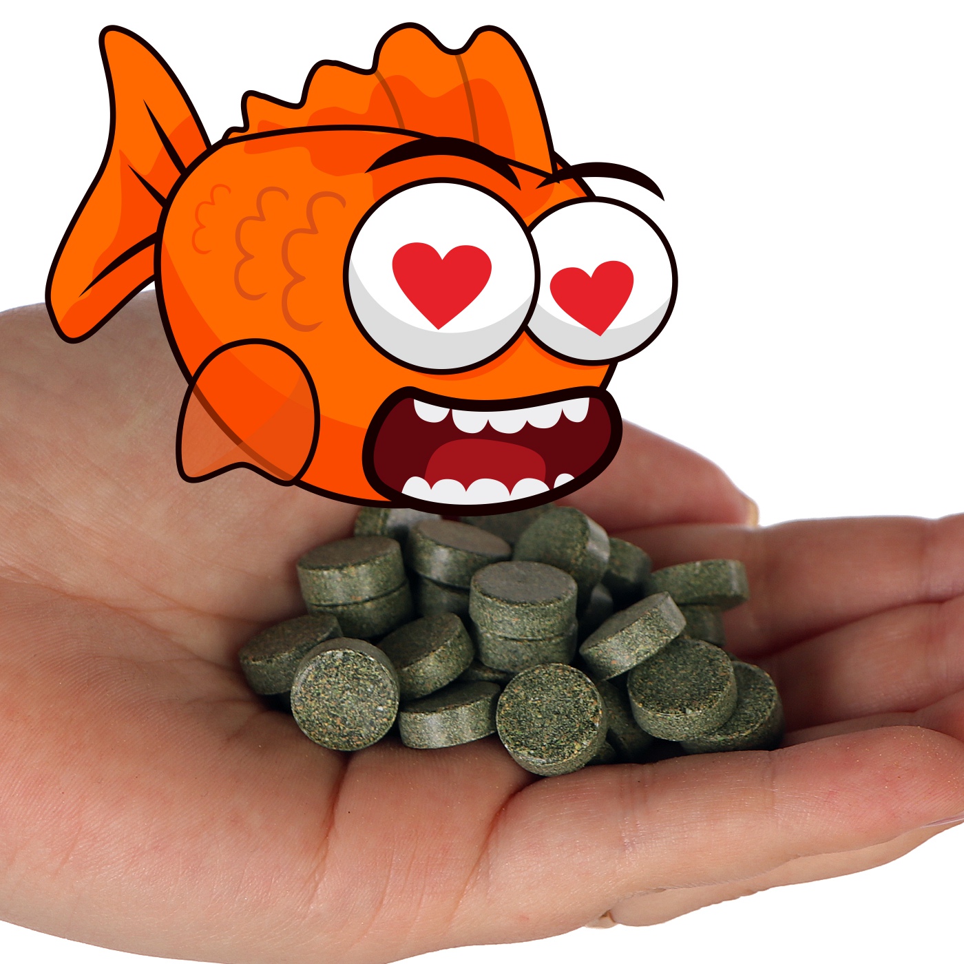 еда в виде таблеток. Быстро падает на дно. Не вызывает поворота воды