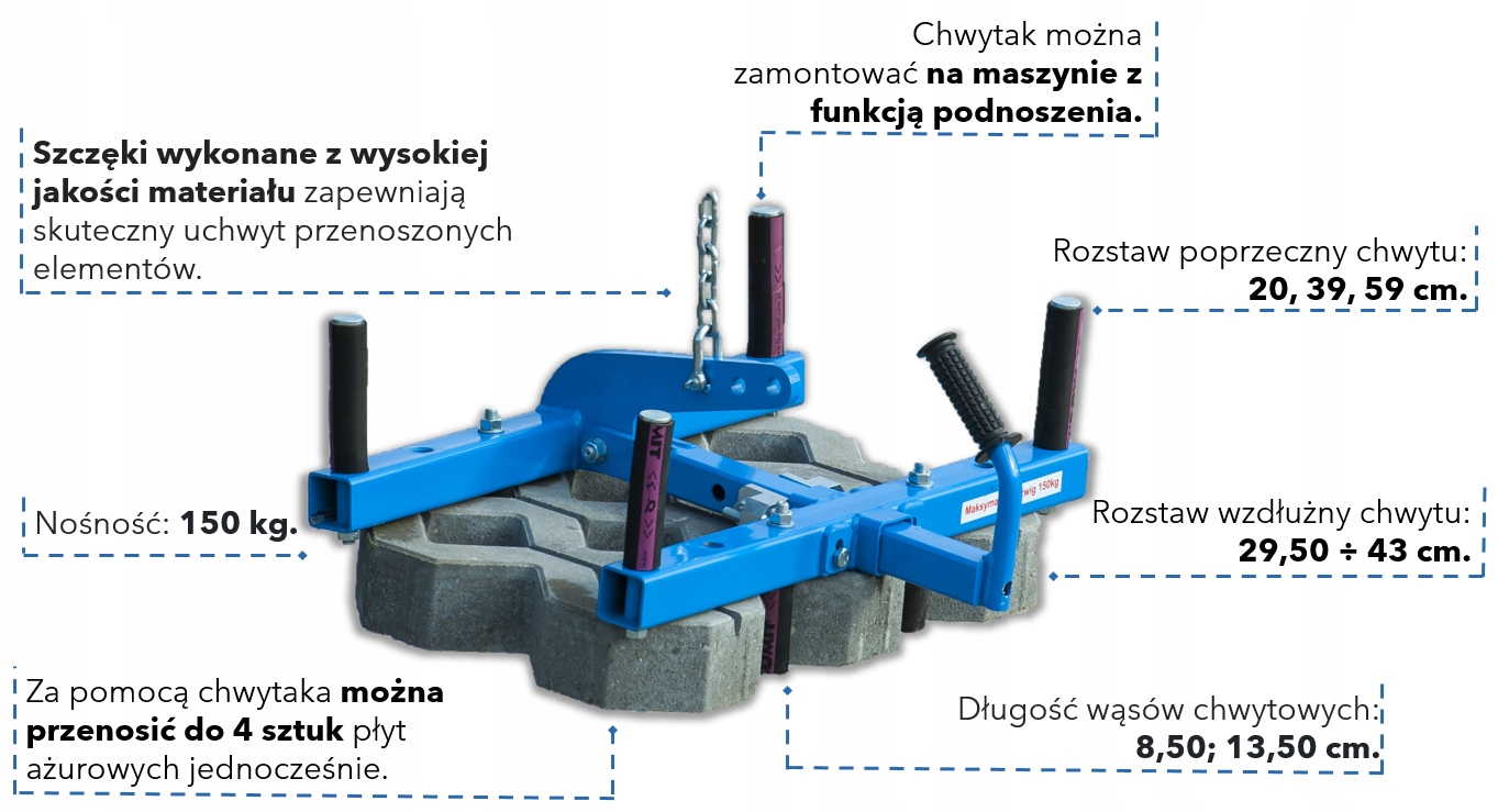 Захват можно использовать для перемещения до 4 штук ажурных плит одновременно. Захват предназначен для установки на большинство машин с функцией подъема. Характеризуется управлением одним человеком.