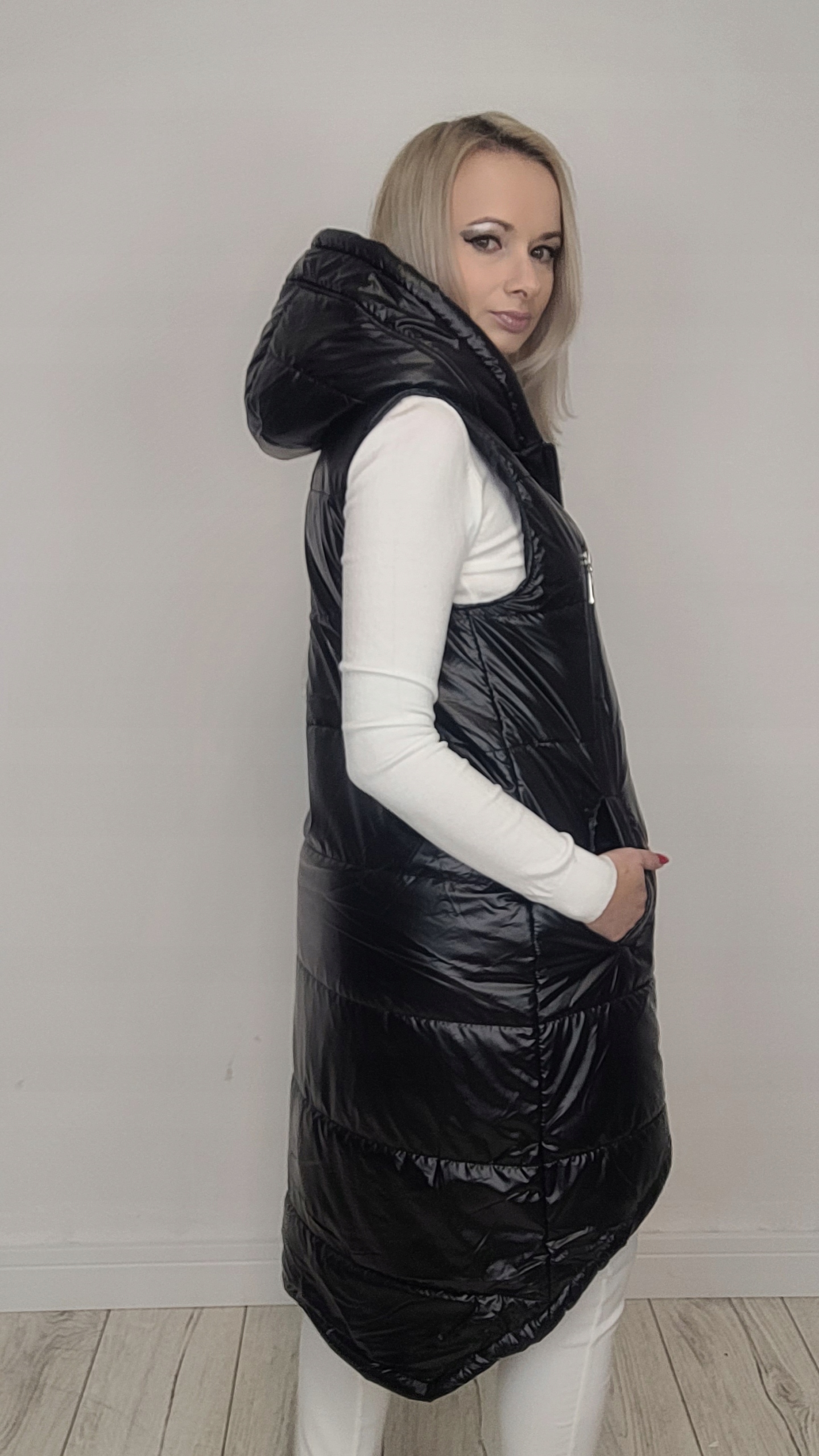 Женский стеганый жилет с капюшоном. Жилет и карманы на молнии. Просторный капюшон защитит от ветра. Жилет имеет двустороннюю молнию, водонепроницаемая ткань, из которой он изготовлен, обеспечивает комфорт ношения даже в неустойчивую погоду.