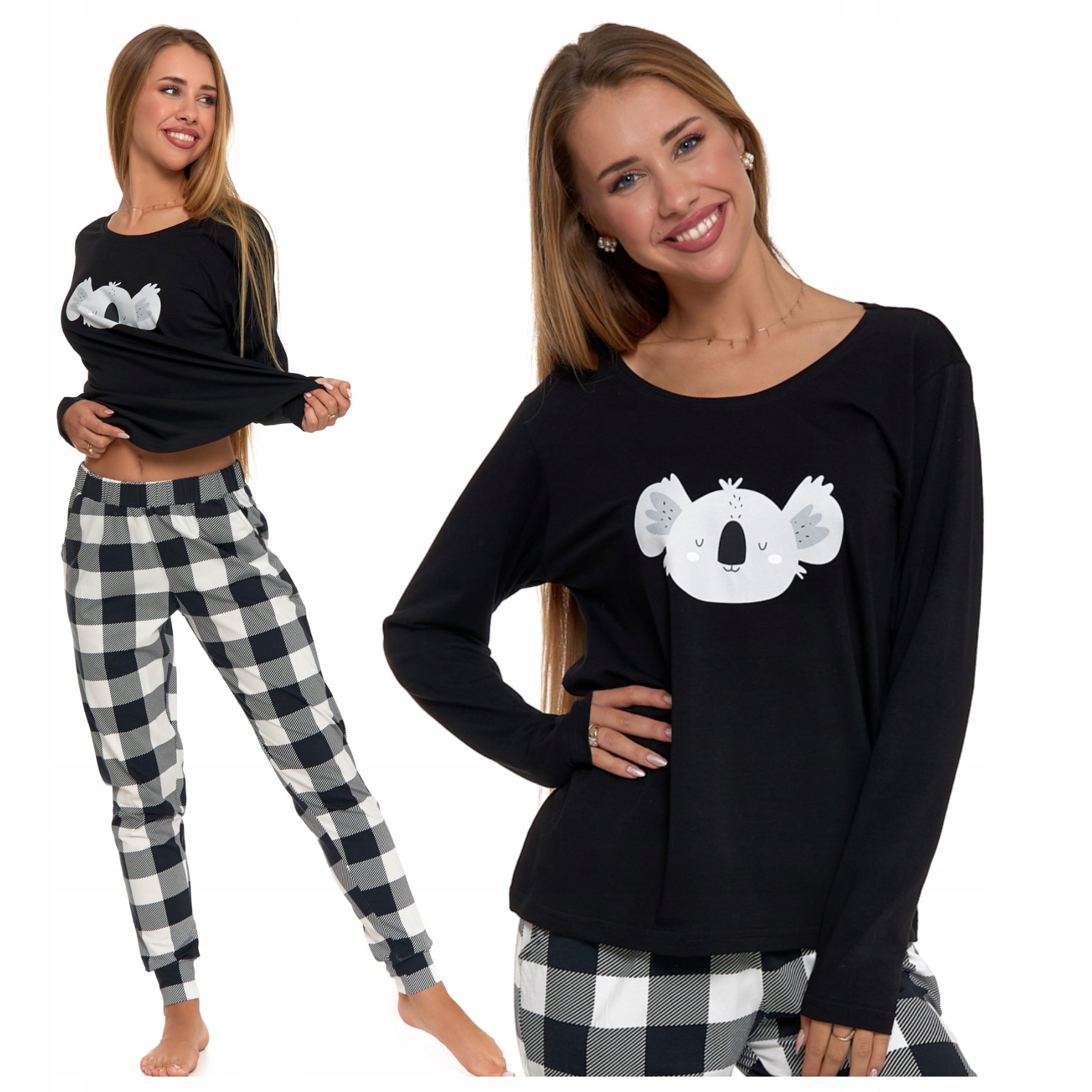Эти хлопковые пижамы — идеальное сочетание комфорта и очарования. Рисунок коалы на футболке добавляет приятную легкость, а длинные брюки в клетку с манжетой станут прекрасным дополнением комплекта. Если вы ищете пижаму, в которой вы будете чувствовать себя особенным и приятным во время сна, это предложение наверняка вас очарует.