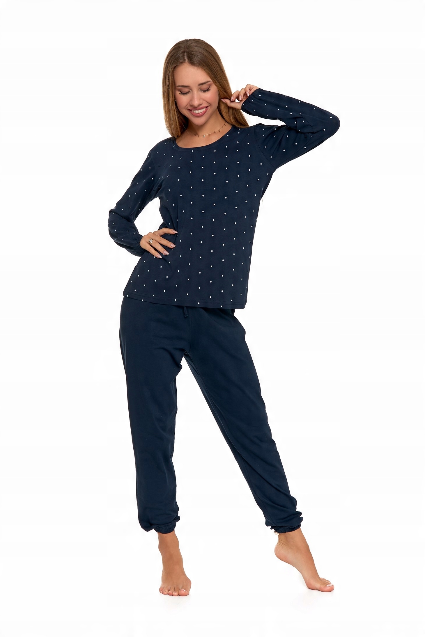 Эти пижамы – это сочетание комфорта, стиля и доступности для всех женщин, независимо от размера. Эта длинная пижама в горошек из мягкого хлопка с добавлением эластана обеспечит комфорт и тепло во время сна.