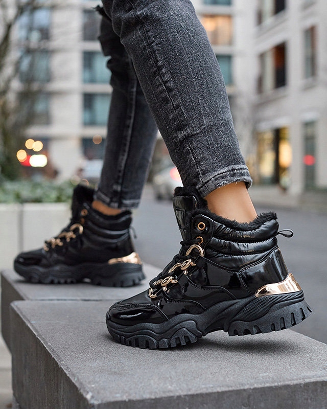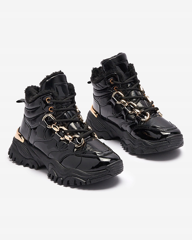 Женские спортивные, зимние походные ботинки на массивной подошве. Верх выполнен из комбинации лакированной экокожи и искусственного клеенчатого материала. Пара зашнурована и имеет меховой утеплитель.