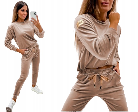 ЖЕНСКИЕ СПОРТИВНЫЕ КОСТЮМЫ КОМФОРТНЫЙ ЖЕНСКИЙ БАРХАТНЫЙ СПОРТИВНЫЙ КОМПЛЕКТ СВИТШОТ С ЛЕНТОЙ КАПУЧИНО БРЮКИ XL/42 ПОЛЬСКОГО ПРОИЗВОДСТВА
