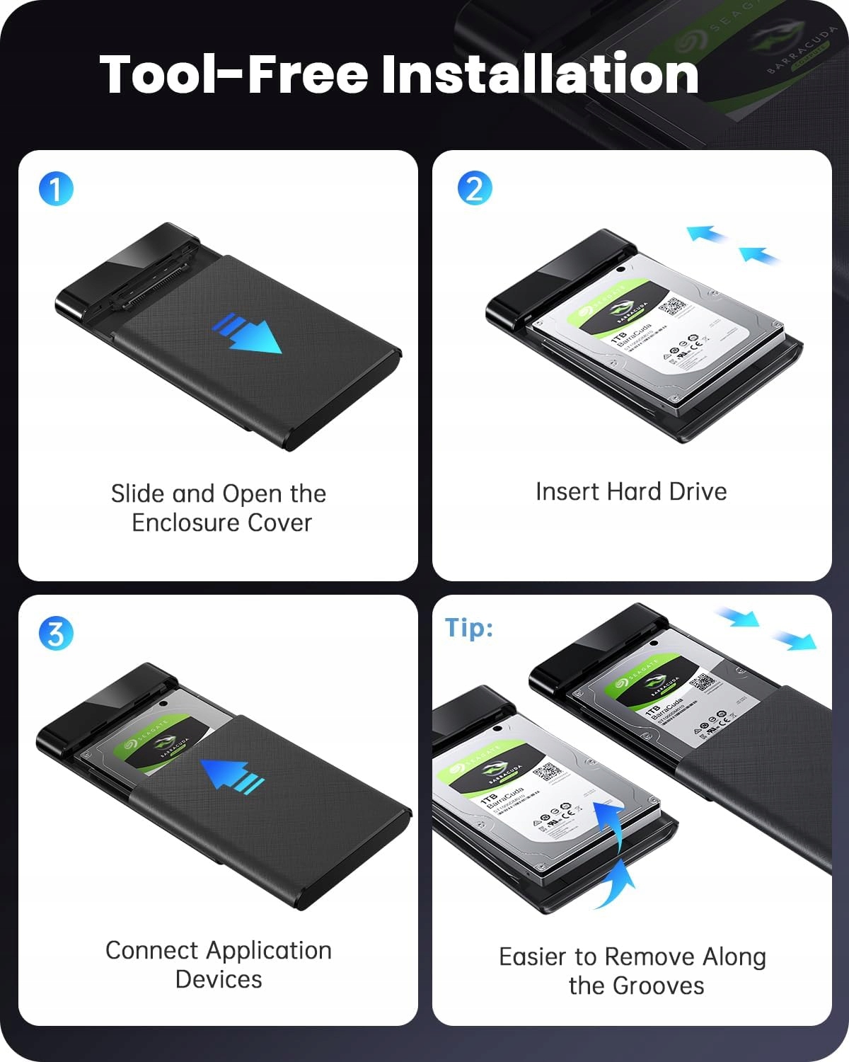 🌠𝐔𝐧𝐢𝐯𝐞𝐫𝐬𝐚𝐥 𝐂𝐨𝐦𝐩𝐚𝐭𝐢𝐛𝐢𝐥𝐢𝐭𝐲: этот внешний корпус SSD/HDD предназначен для 2,5-дюймового SATA 7 мм/9,5 мм жесткого диска и SSD до 4 ТБ. В соответствии с Windows, Linux и Mac OS и новыми системами, а также Western Digital, Toshiba, Samsung, Kingston, Wrucial, Hitachi и т. Д. В соответствии с жесткими дисками. 1.1)