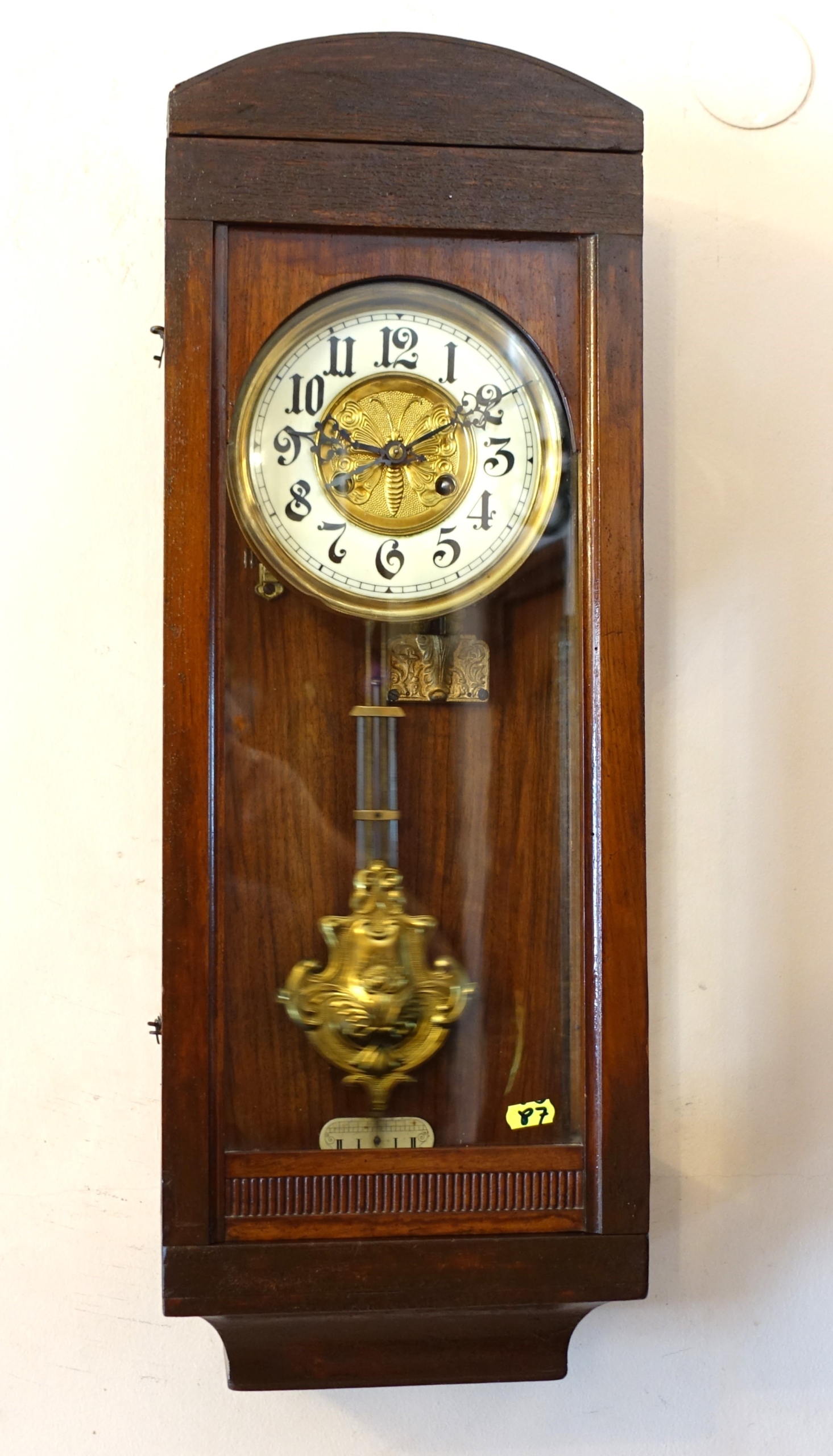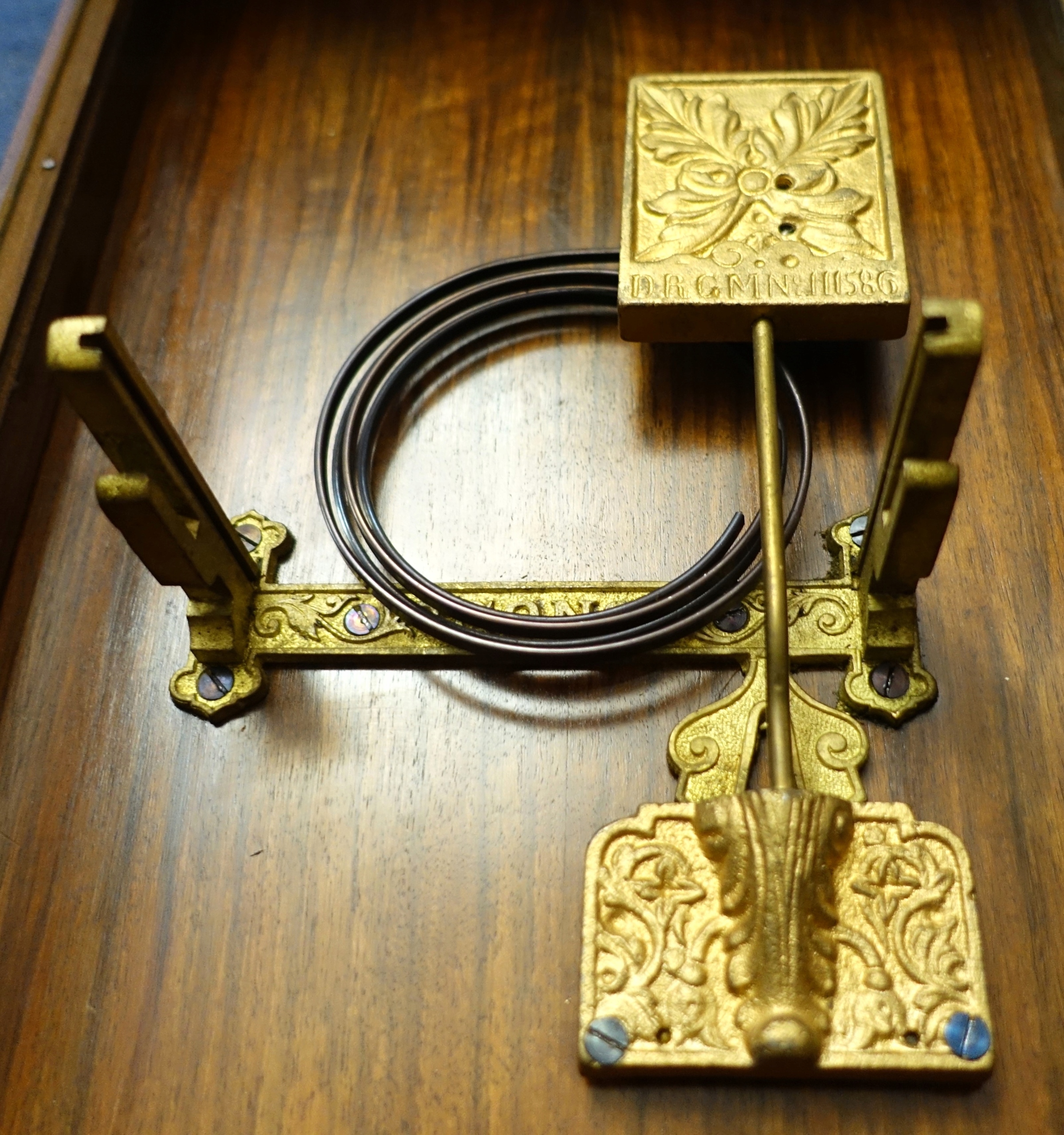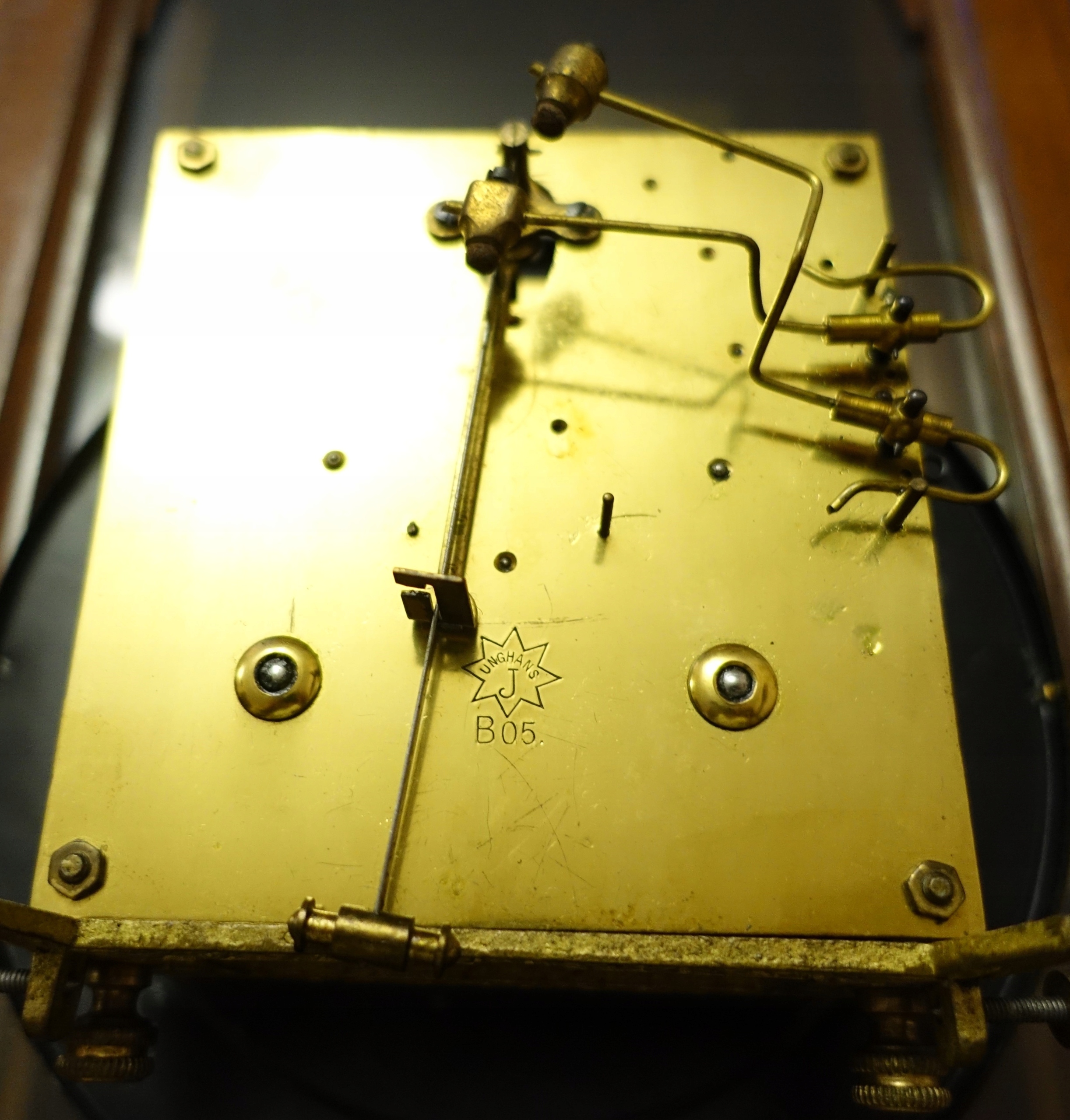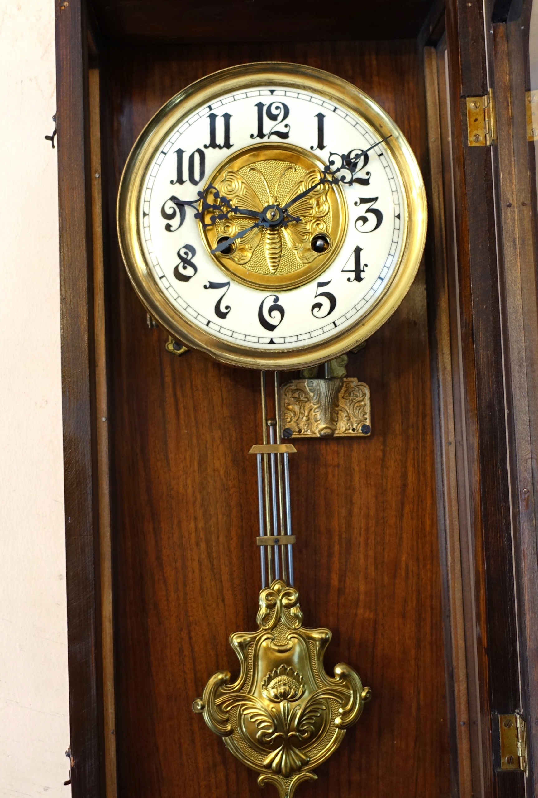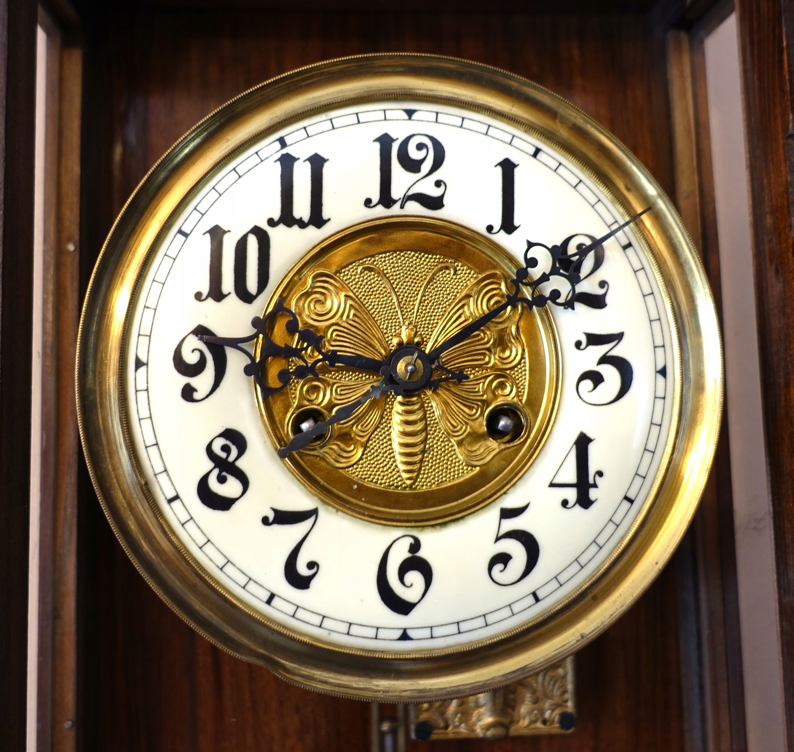Часы Юнганса четвертьчасовые, подвесные, с двумя молоточками, две отдельные спирали (очень редкая модель механизма). Часы полностью работоспособны, отбивают целые часы и половинки, причем часы отбивают четверти каждые 15 минут. заводятся на ключ.
