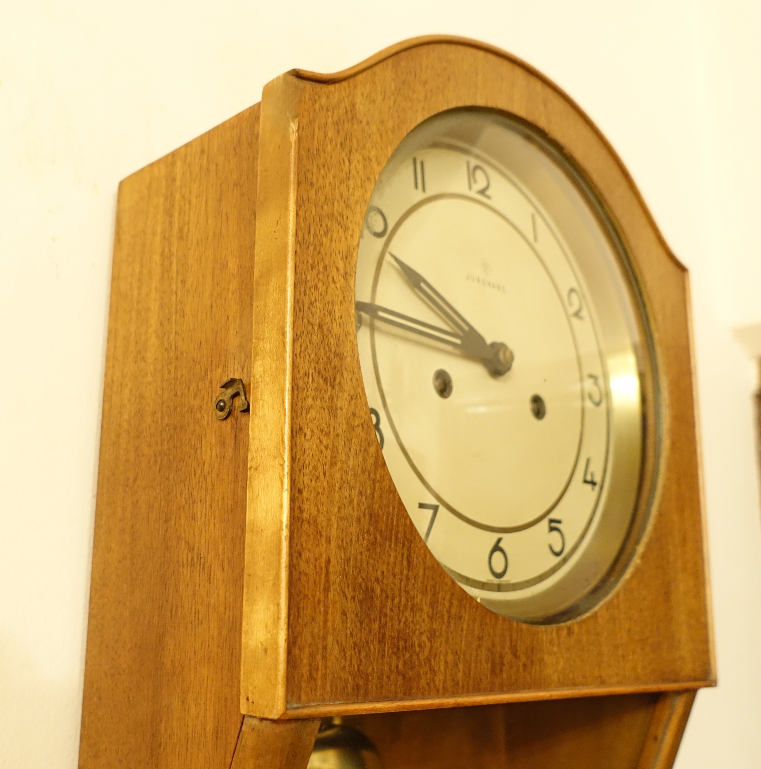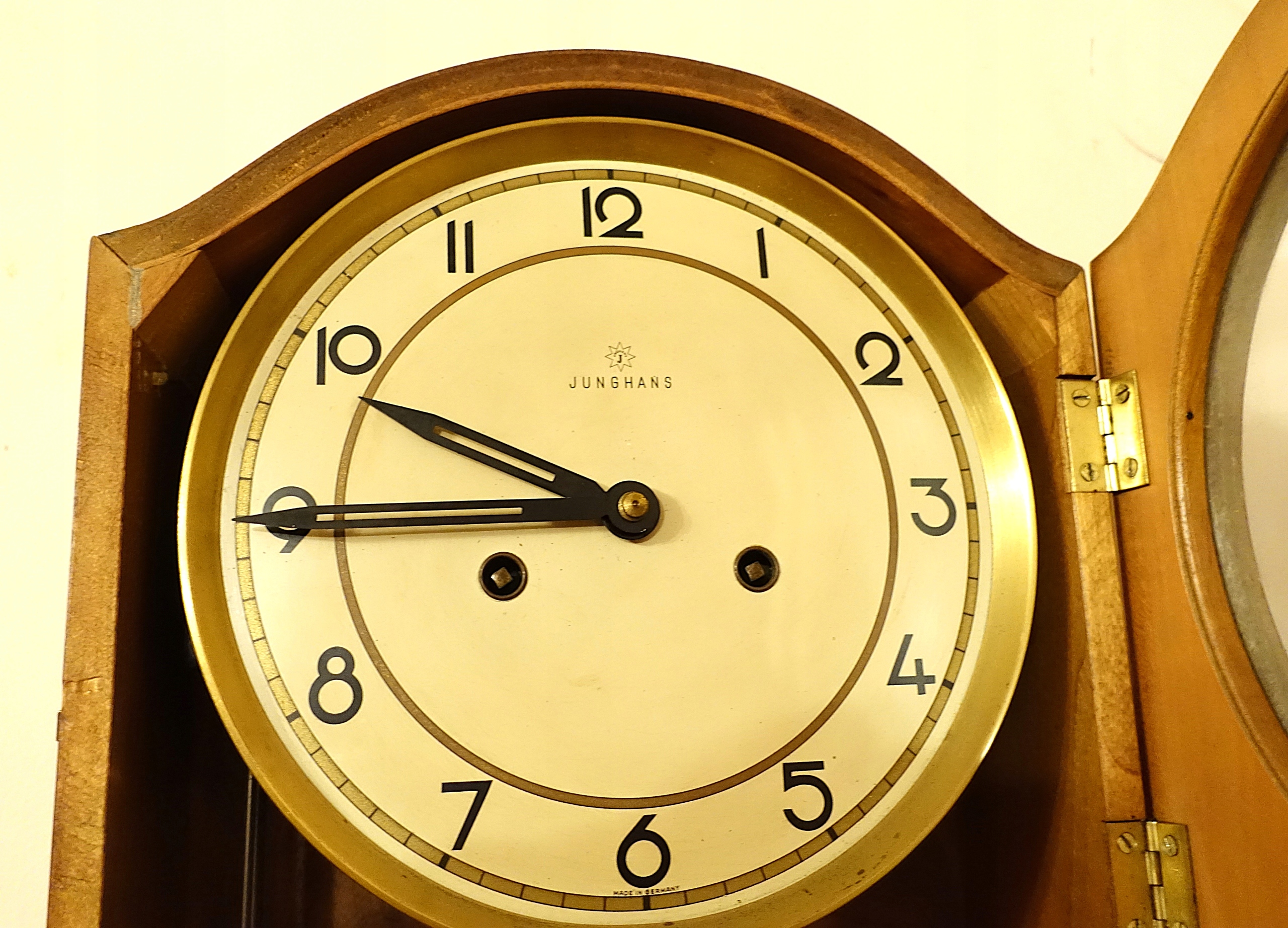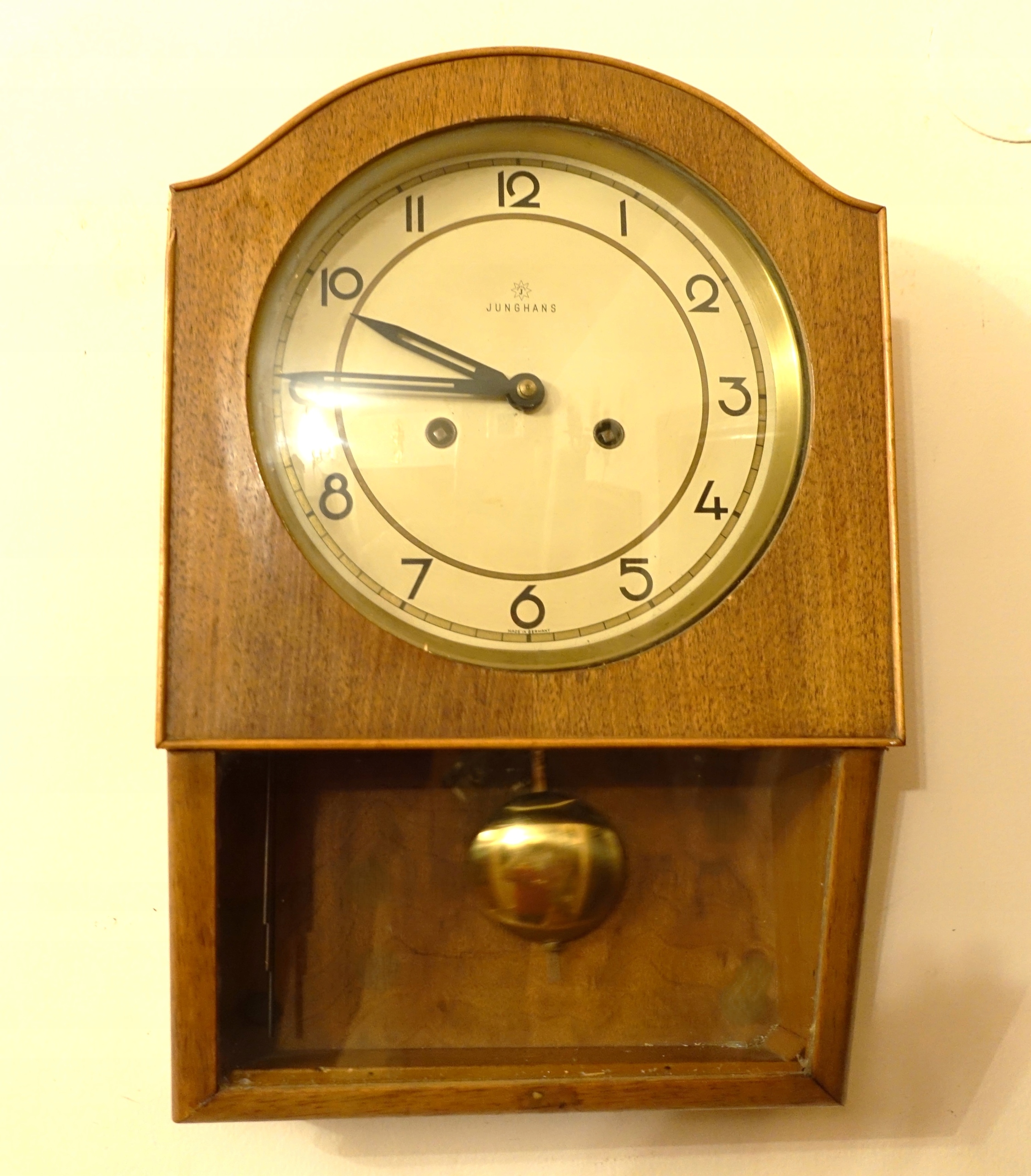 Красивые настенные часы Junghans. Имеет механический подпружиненный маятник, который отбивает полные и получасовые часы по трехструнной системе (три струны, три молоточка)
