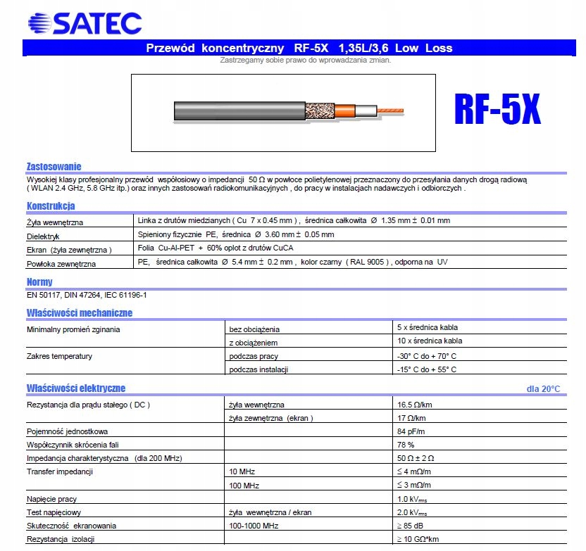 Кабель RF-5 SATEC с низкими потерями не намного толще популярного RG-58, но гораздо более устойчив к погодным условиям. На высоких частотах затухание гораздо ниже, чем в случае с РГ-58.