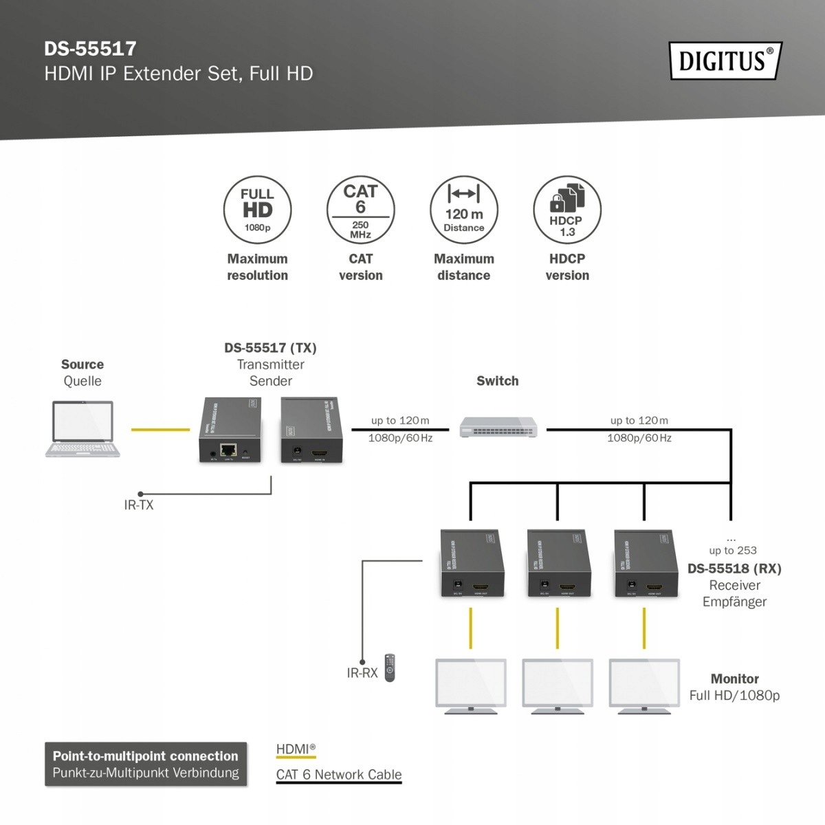 Комплект удлинителя HDMI представляет собой высокопроизводительную систему расширения видеосигнала, состоящую из модулей передатчика и приемника. Расширяет дальность передачи аудио-видео сигнала Full HD до 120 м с помощью сетевого кабеля CAT6 (соединение «точка-точка»). Кроме того, вы можете использовать сетевые коммутаторы и модули с одним приемником (DS-55518) для передачи видеоконтента через существующую сетевую инфраструктуру (IP-соединение) на 253 дисплея и расширить зону покрытия на неограниченное расстояние. Кроме того, встроенный интерфейс двунаправленного инфракрасного (ИК) сигнала позволяет удаленно управлять источником входного сигнала через выходной экран (на стороне приемника).