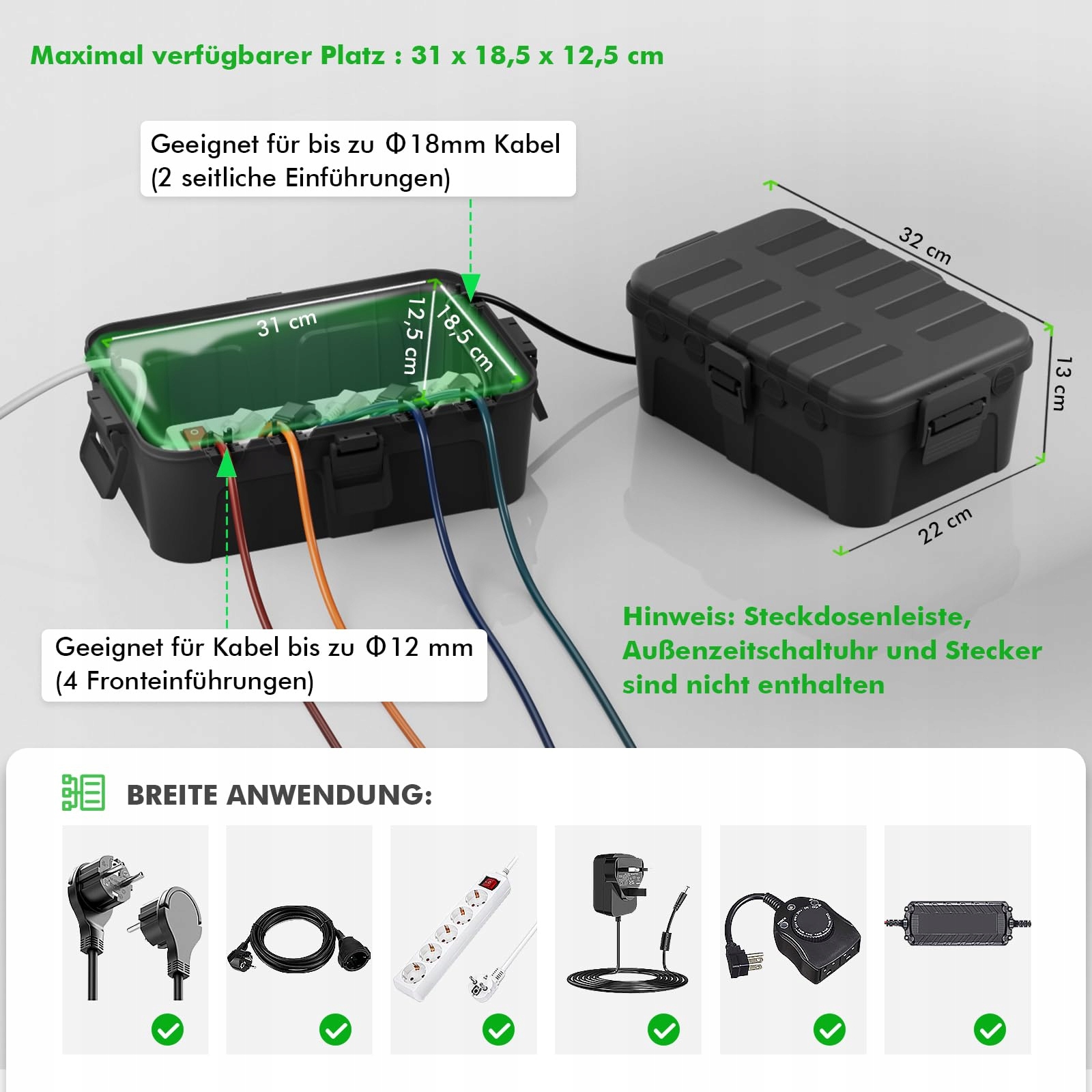 ✅ предназначен для обеспечения безопасности и стабильности временных кабельных соединений снаружи. Благодаря большим размерам (34,5 x 24 x 12 см) и 6 кабель кабеля (4 спереди + 2 сбоку) это комплексное решение для защиты внешних мощностей, розетков таймера, удлинительных шнуров, больших адаптеров и большинства других электрических соединений.