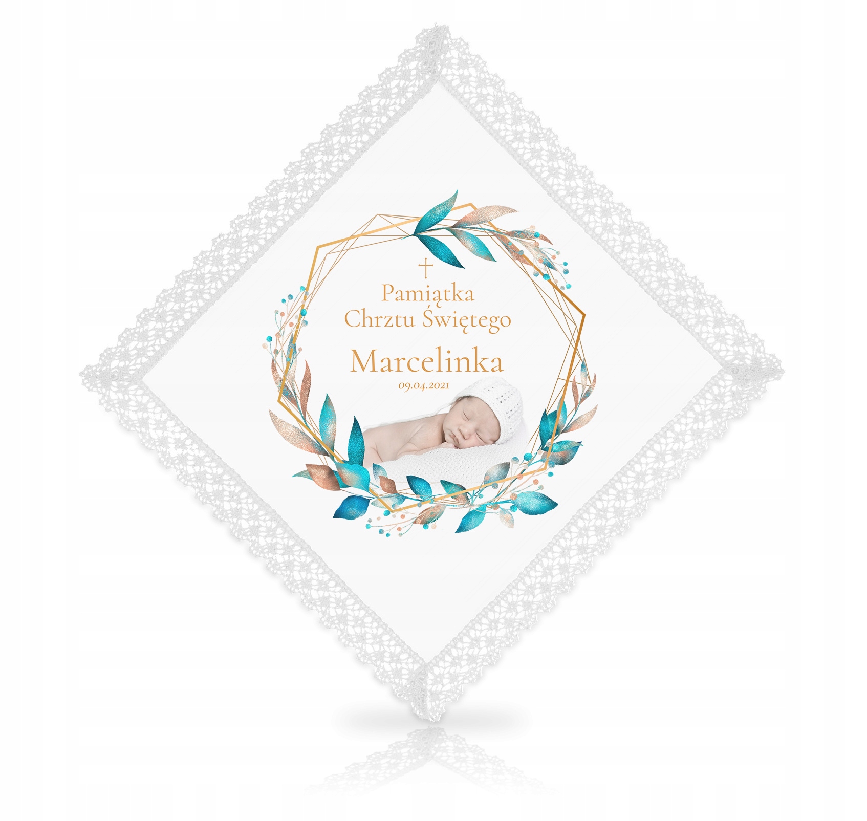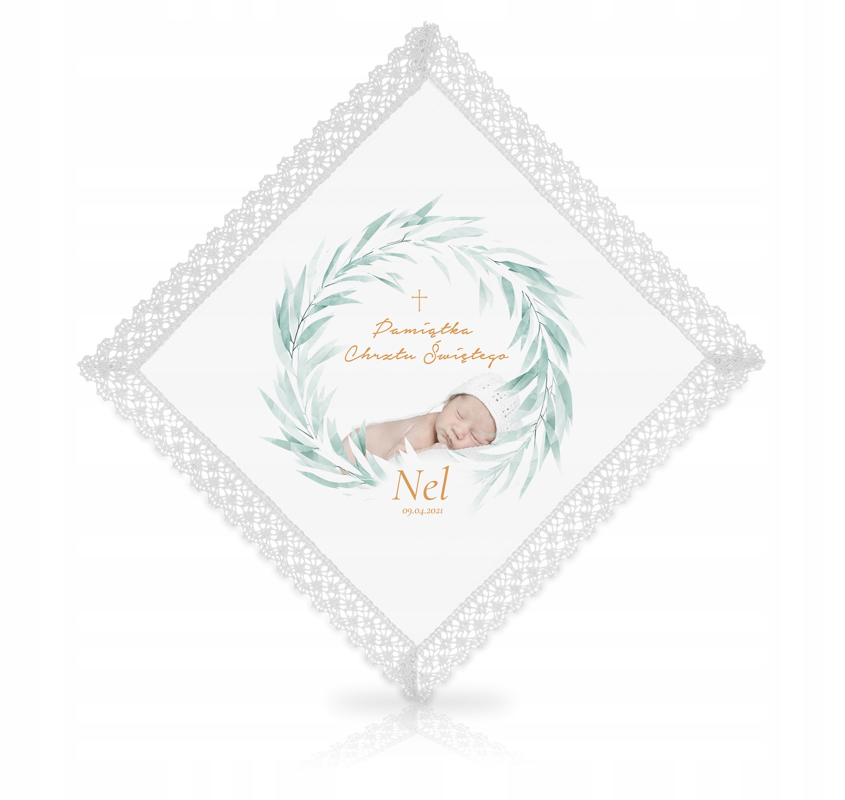 Крестильная одежда в виде носового платка – это незаменимый аксессуар, который следует приобрести Крестной. Красивый мотив хлопковоекружево идеально сочетается с именем ребенка и датой на одежде.