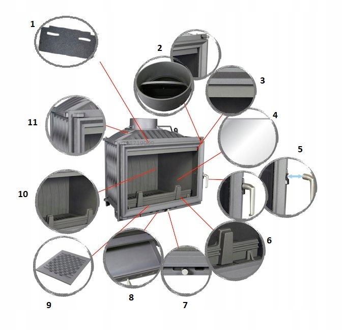11. Материал: чугун – прочный, долго сохраняет температуру. Стенки камина толщиной минимум 8 мм гарантируют безаварийную работу печи. Плотно расположенные радиаторы — благодаря им камин передает больше тепла в окружающую среду.