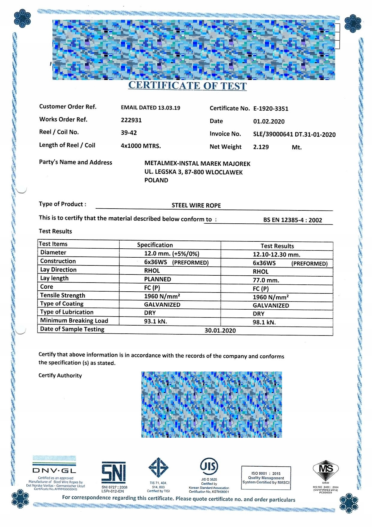 Канаты сертифицированы по DIN 3064, BS EN 12385-4:2002.