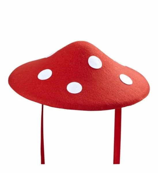 Toadstool Hat является идеальным дополнением к костюму для предстоящей карнавальной вечеринки или выступления. Продукт посвящен молодым людям и взрослым. Его преимущества - размер и производительность войлока. Красная шляпа с белыми точками привязана красной лентой под шеей.