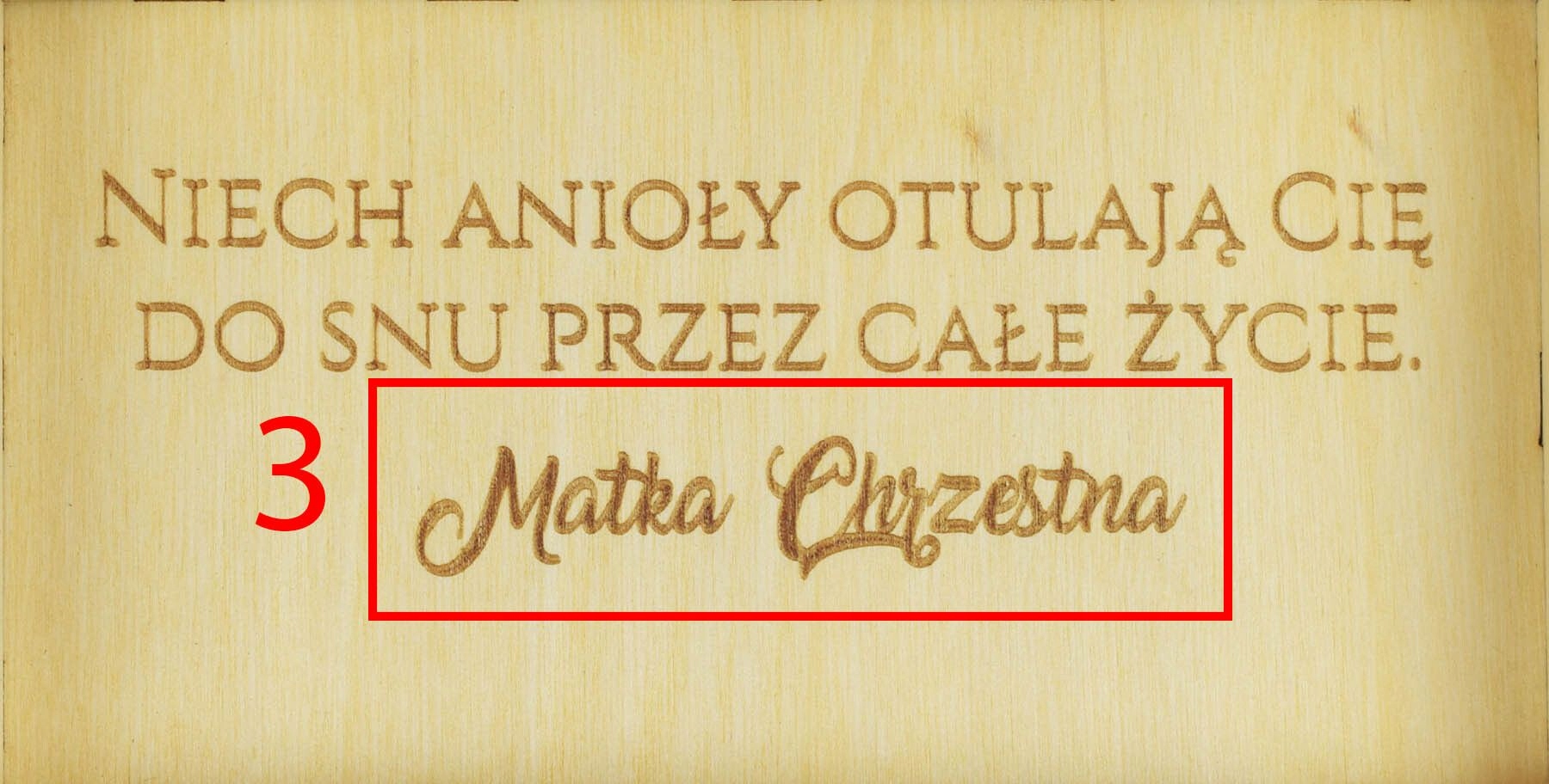 При покупке дополнительной услуги гравировки (доступна на других наших аукционах) мы можем заменить текст с выкройки на текст, предоставленный покупателем. Помните, что количество отправленных клиентом символов должно соответствовать количеству символов текста из шаблона.
