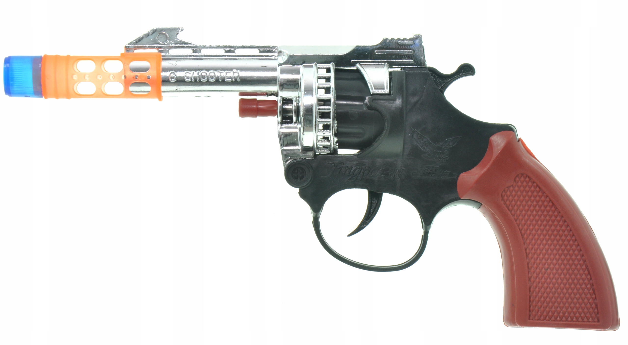 Револьвер имеет барабан с 8 выстрелами, который открывается с рычагом. Мы положили кружево 8 выстрела в открытый журнал. Каждое нажатие на триггера вызывает прыжок барабана на одну позицию, в этот момент игла попадает на нагрузку, помещенную в кружево. Пистолет стреляет громко и последовательно 8 раз. Когда барабан выполняет полный оборот, мы открываем револьвер и надеваем еще один кружево. Револьвер со съемным муо