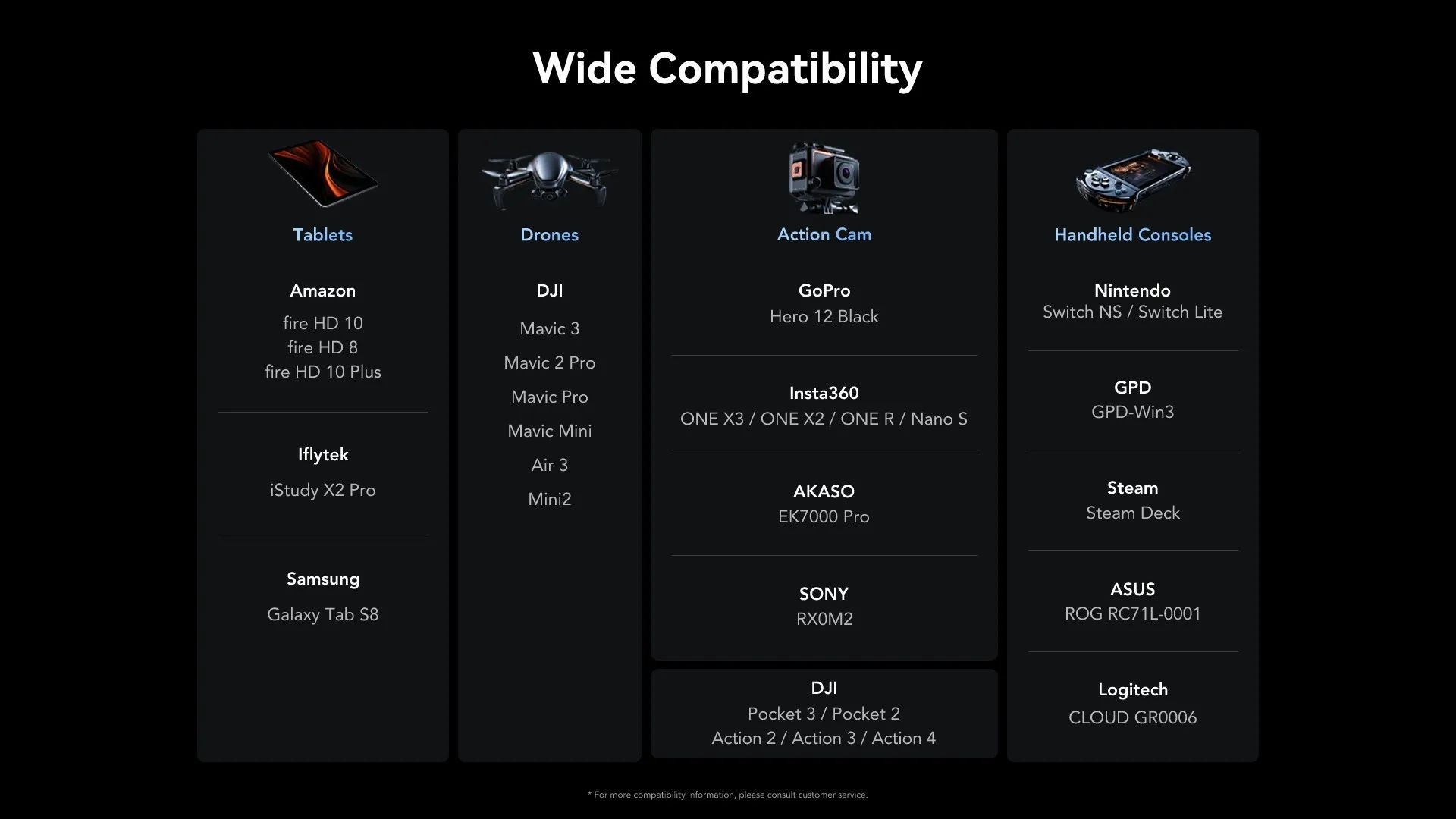 Широкая совместимость с различными устройствами, в том числе Модели DJI, GoPro, Nintendo и SteamDeck.