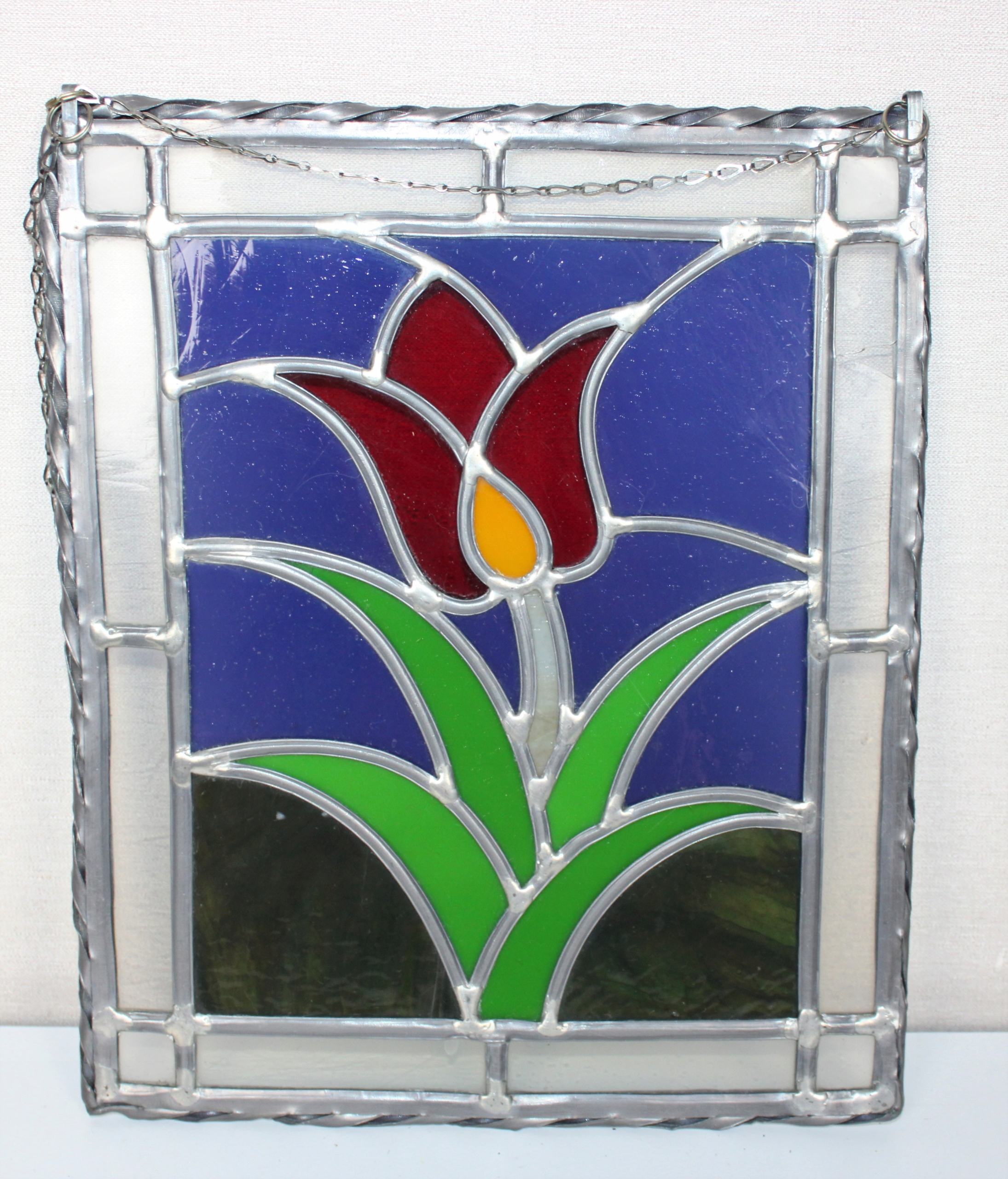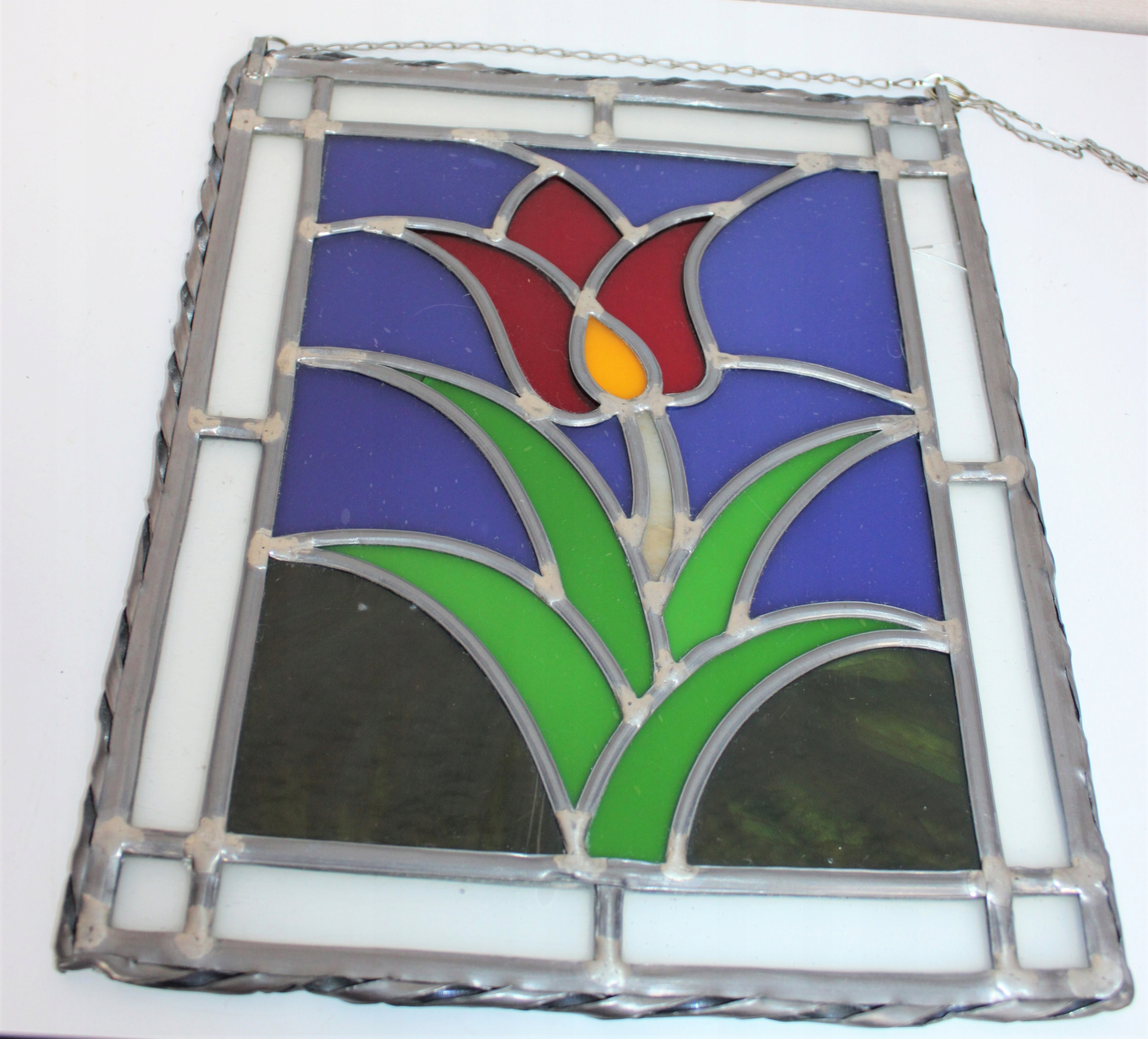 Витраж в хорошем состоянии. На раме есть трещины на белом стекле, на последнем фото.