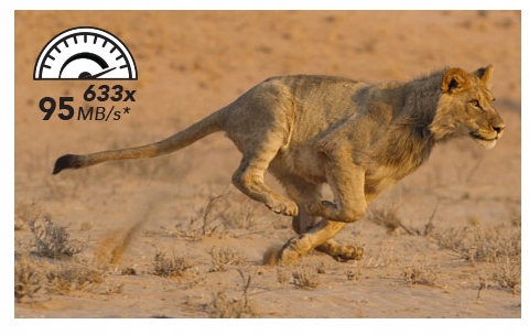 Карта класса скорости 10 с высокопроизводительной технологией 633x UHS-I обеспечивает скорость передачи данных до 633x (95 МБ/с*), что позволяет вам наслаждаться любимым мультимедийным контентом, где бы вы ни находились.