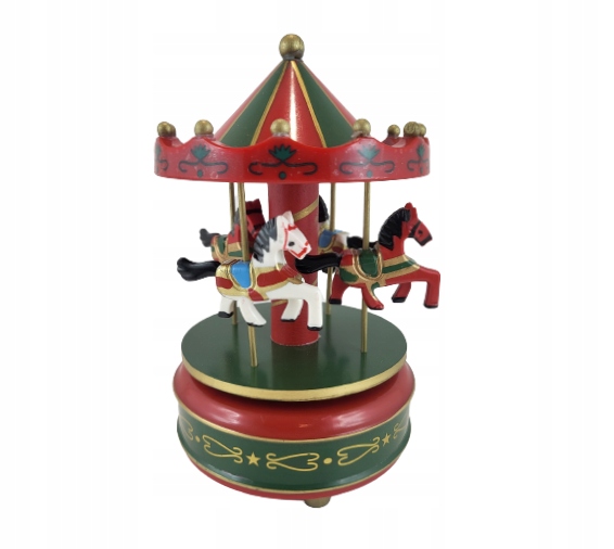 Карусель на круглой платформе в сказочном стиле, зелено-красная. Будет отличной идеей для подарка, поместив его на консоль или под елку, он придаст интерьеру сказочную новогоднюю атмосферу.
