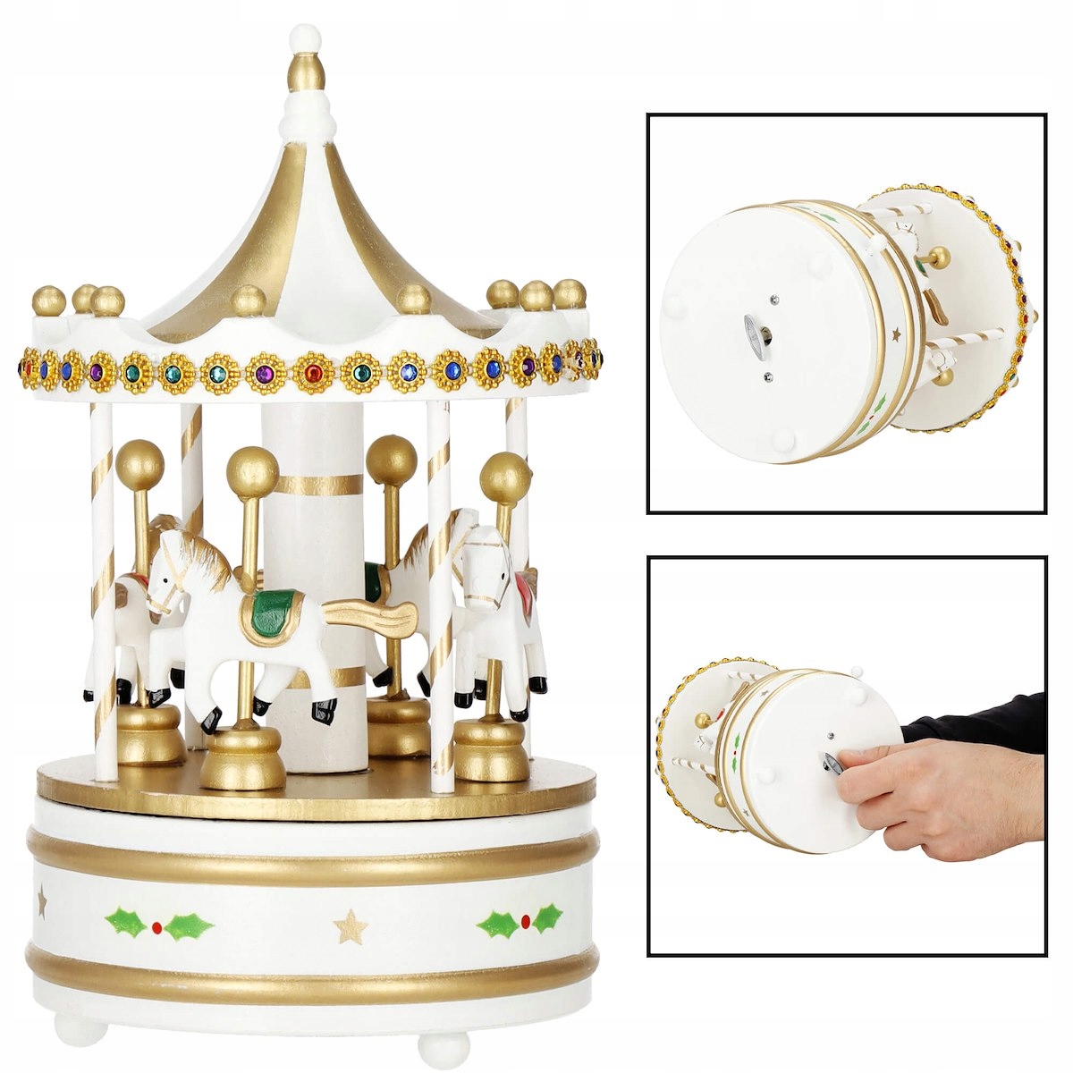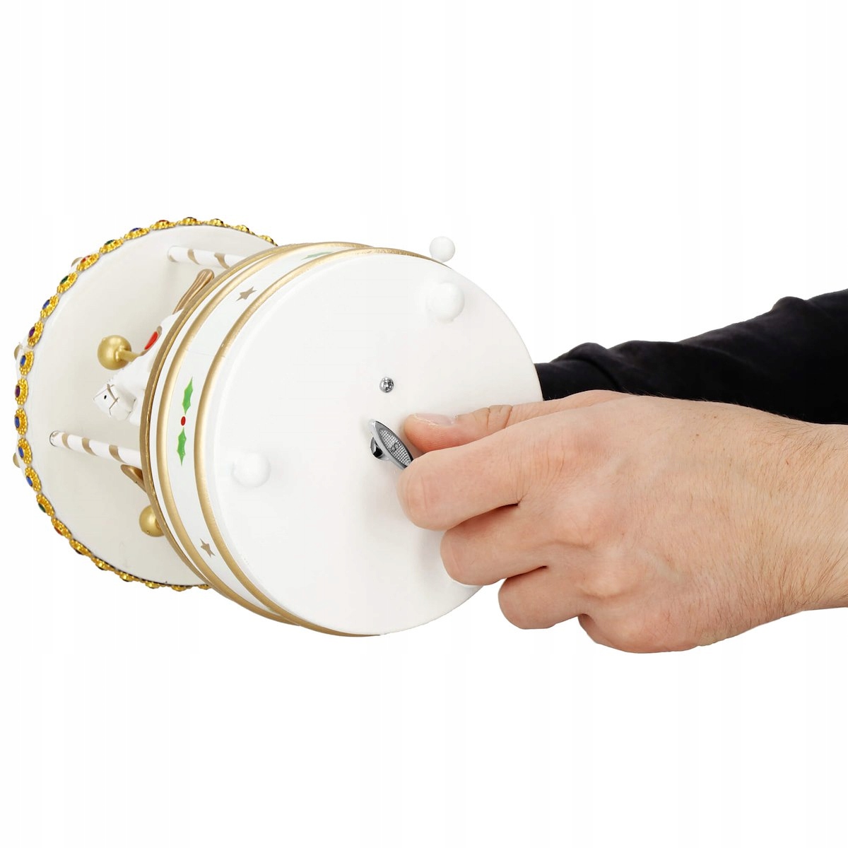 Вы можете завести эту очаровательную музыкальную шкатулку снизу, повернув металлическую рукоятку, которая активирует механизм, и вытащив деревянную замок. Достаточно всего мгновения, чтобы увидеть, как вращается карусель, и услышать успокаивающие, умиротворяющие звуки.