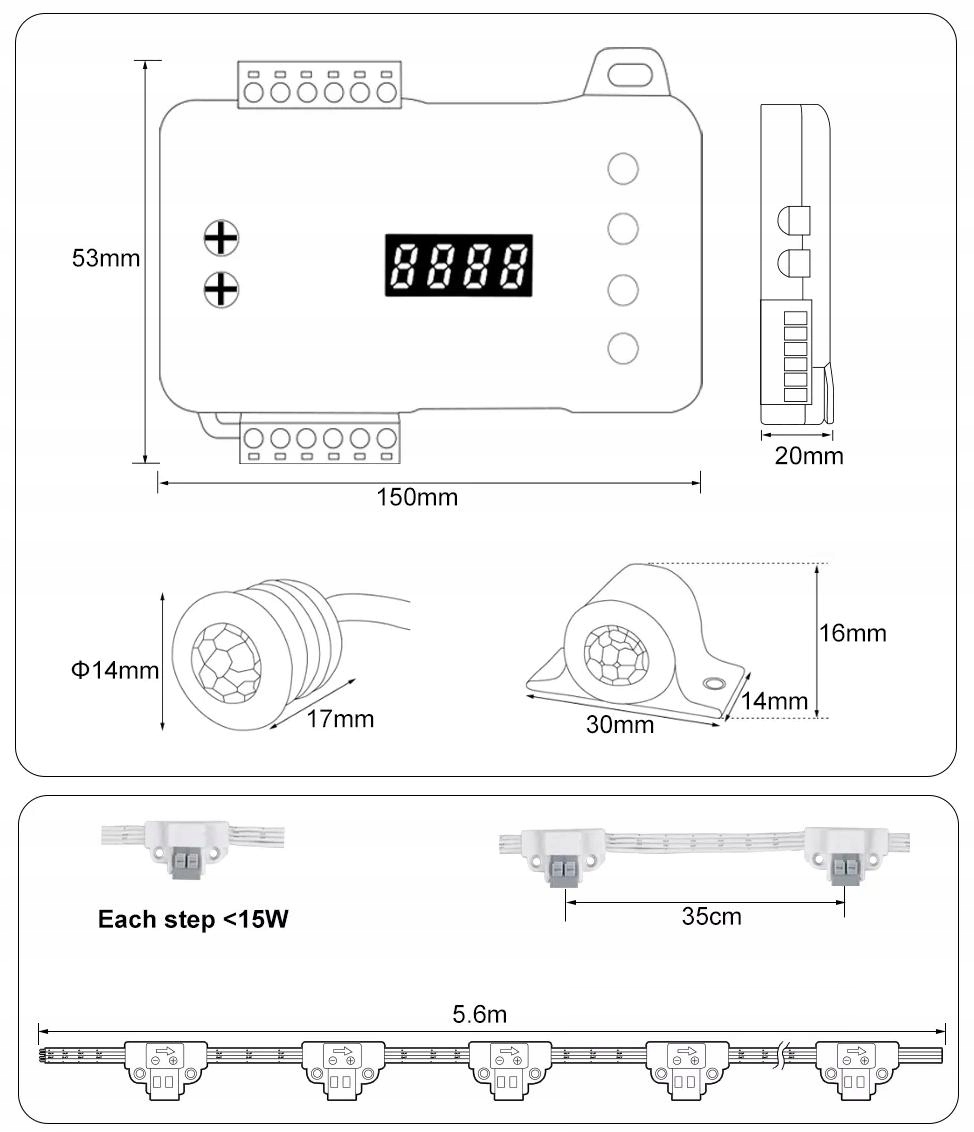 Контроллер оснащен 2 PIR-датчиками на тросах, которые прокладываются внизу лестницы и вверху лестницы. Когда один из датчиков обнаруживает движение (входим или выходим), освещение включается последовательно от первого к последнему или от последнего к первому, в зависимости от того, какой датчик зафиксировал движение.