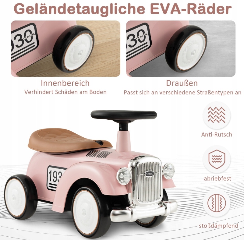 Эта игрушечная машинка изготовлена из высокопрочных материалов и создана для того, чтобы сопровождать детей по мере их взросления. Благодаря рабочему рулю малыши смогут легко повернуть влево или вправо. А угол поворота, ограниченный 40°, гарантирует, что дети не упадут в сторону во время езды. Кроме того, слегка изогнутое сиденье позволяет детям сидеть комфортно. Повернув ручку, сиденье можно снять, создав практичное место для хранения детских вещей. Что еще более важно, большие и гладкие колеса хорошо адаптируются к различным дорогам. Это означает, что дети могут кататься в помещении или на улице, получая разный опыт. Все это отличный способ развить у детей мелкую моторику и улучшить баланс. С другой стороны, ретро-облик с наклейками делает этот автомобиль более привлекательным для детей.
