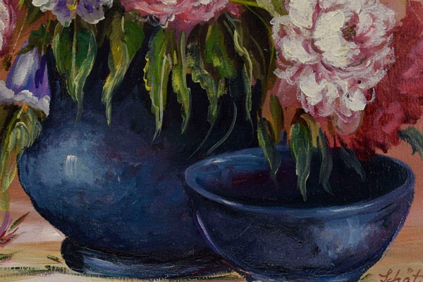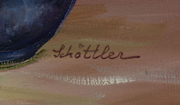 изображение масла, нарисованное на холсте, расположенное на растяже. На картинке показан букет цветов в синей вазе. Оттенки фиолетового, белого и розового на теплом бежевом фоне доминируют на изображении. Идеально подходит для классических и романтических интерьеров. h1> Изображение подписано в правом нижнем углу: «Шоттлер». h1> Катарина Шоттлер (1935–2016) была хорошо известным немецким художником. Ее работа часто отражала глубокий интерес к человеческому существованию, эмоциям и отношениям между человеком и природой. Шоттлер объединил традиционные методы с современными элементами, создавая вневременные и отдельные работы. Ее картины характеризовались тонкими цветами, точными дизайнами деталей и сбалансированной композицией, часто несущей меланхолическое или медитативное настроение. За свою карьеру она представила работы на многочисленных важных выставках, получив признание как в Германии, так и за рубежом. Катарина Шоттлер оставила четкую следование в немецком мире искусства, ценив художественную чувствительность и способность выражать сложные человеческие чувства с помощью живописи. h2> Изображение изображения хорошо видно на картинках, мы приглашаем вас просмотреть прикрепленные фотографии. Неотъемлемая часть описания изображения.