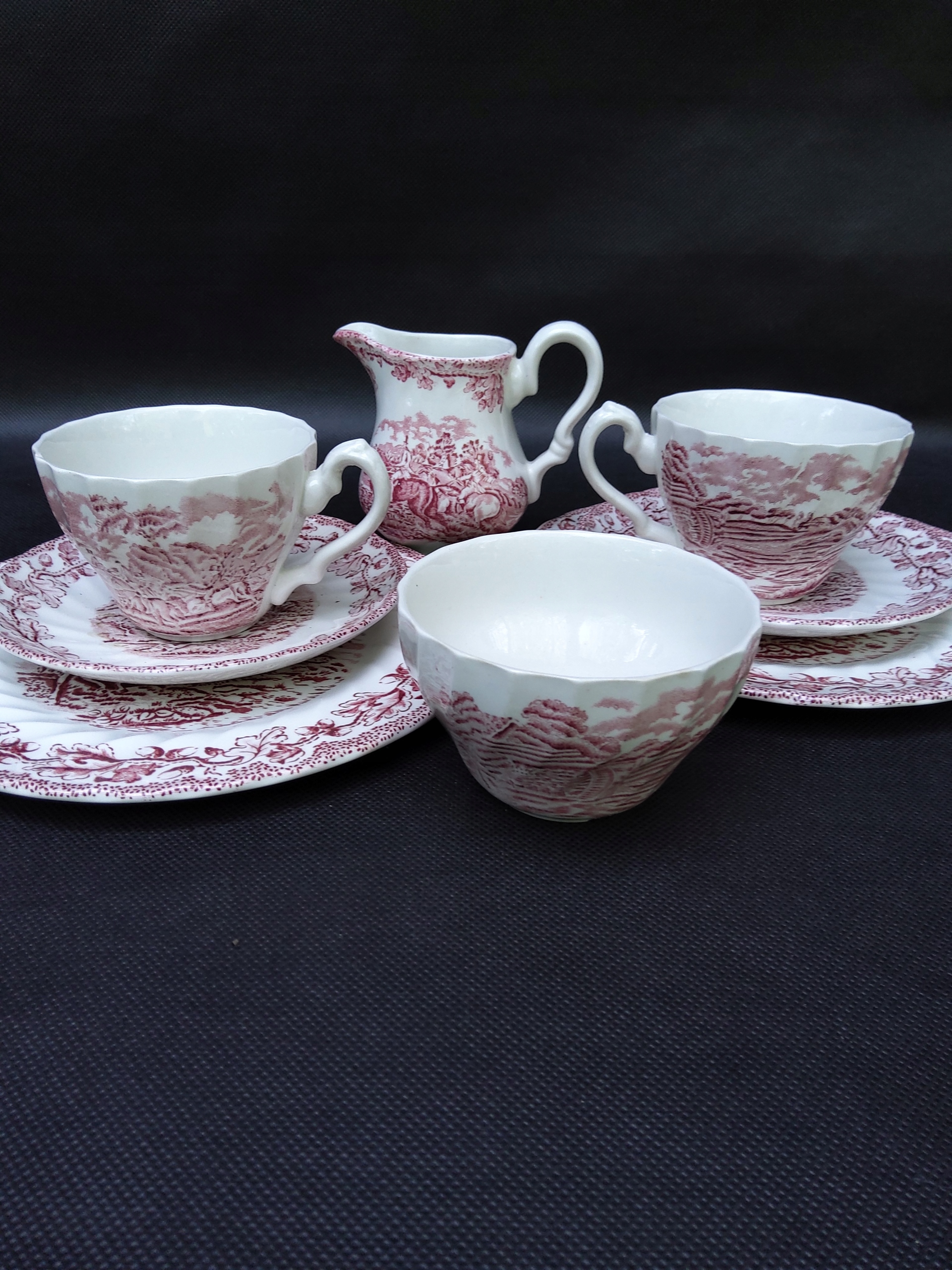 Набор английского фарфора на 2 персоны от английского производителя Myotts Country Life из Стаффордшира. Богатый цветочный декор и жанровые сюжеты, края с завитковой декоративной формой. Состояние хорошее, без дефектов. Молочник, сахарница, 2 чашки. Высота 6,5 см, диаметр края 8,5 см, две подставки по 14 см и 2 десертные тарелки.