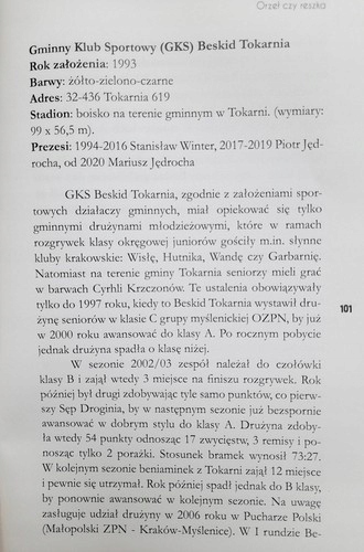 Кроме того, автор представил в книге короткий текст об истории и успехах GKs Beskid, описал силуэты президентов клуба и опубликовал список, разработанный на основе архива клуба (имя и фамилия) 359 игроков, которые играли в Beskids Tokarnia.