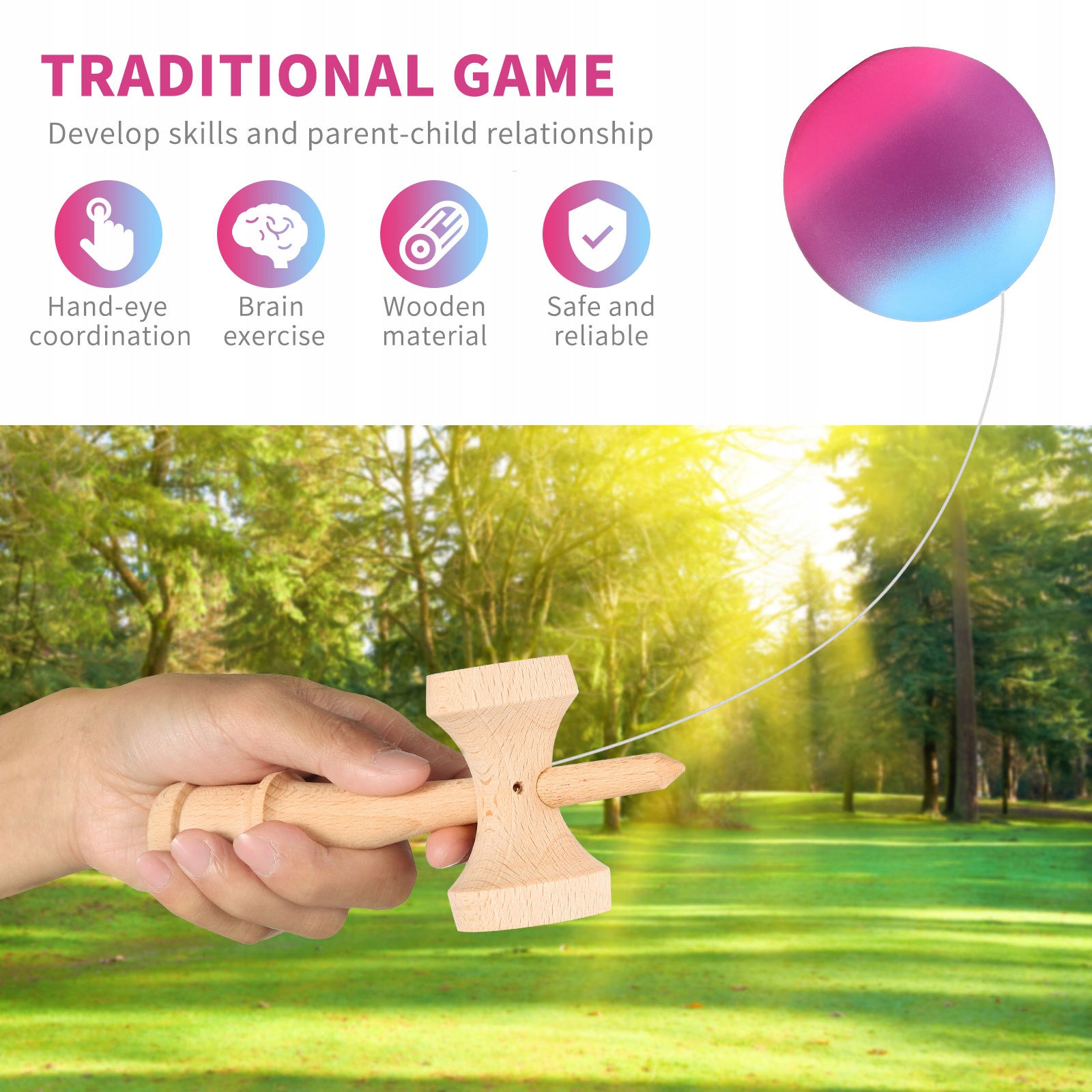 Это традиционная японская игра под названием Кендама, которая помогает развивать зрительно-моторную координацию и крупную моторику. Игра доставляет удовольствие и детям, и родители могут играть вместе со своими детьми, чтобы развивать навыки и отношения между родителями и детьми.