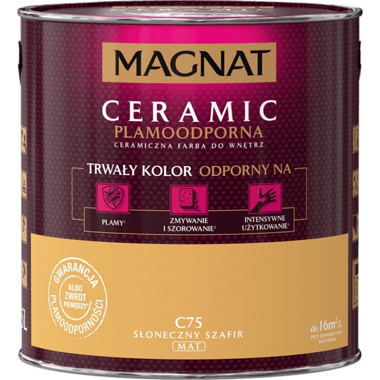 Magnat CERAMIC – краска, предназначенная для декоративно-защитной окраски стен и потолков внутри помещений из цементных, цементно-известковых, гипсовых растворов, кирпича, гипсокартона, деревянных, древесных панелей и обоев, а также из стекловолокна. Благодаря своим уникальным свойствам и долговечности краска рекомендуется для окраски помещений, особенно подверженных загрязнению, а также поверхностей, требующих дезинфекции, например, коридоров, коридоров, частных, офисных и медицинских помещений, гостиных и столовых.