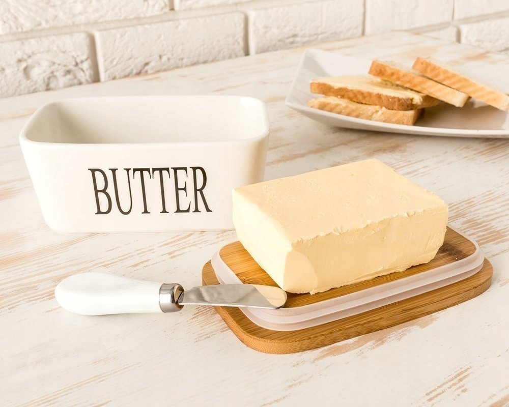 Красивая и стильная фарфоровая масленка с бамбуковой крышкой и ножом для намазывания масла. Оно прекрасно смотрится на столе и сохраняет масло свежим. Бамбуковая крышка с силиконовым уплотнителем также имеет место для аккуратного ножа для смазки с керамической ручкой. Со вкусом и со вкусом.